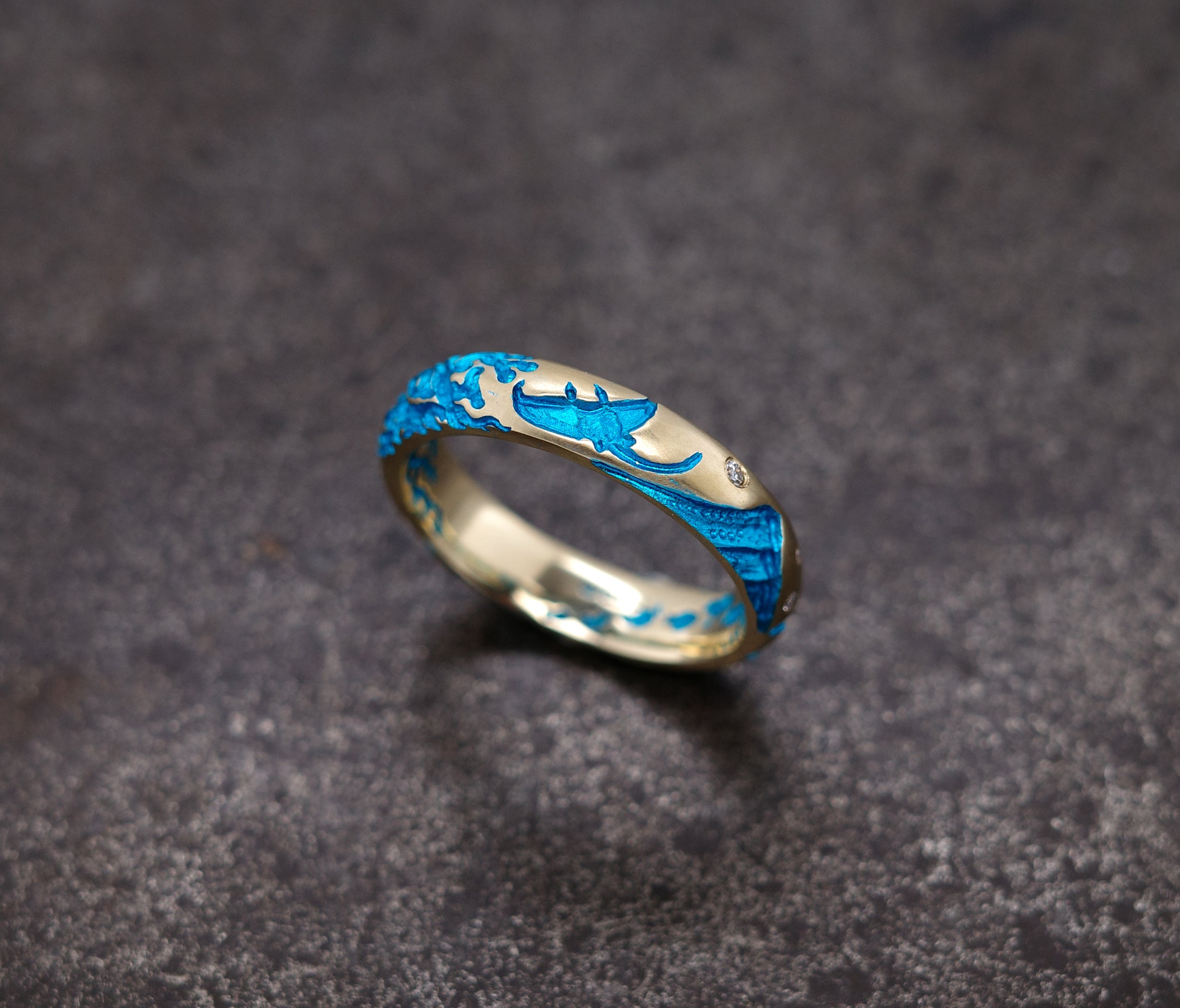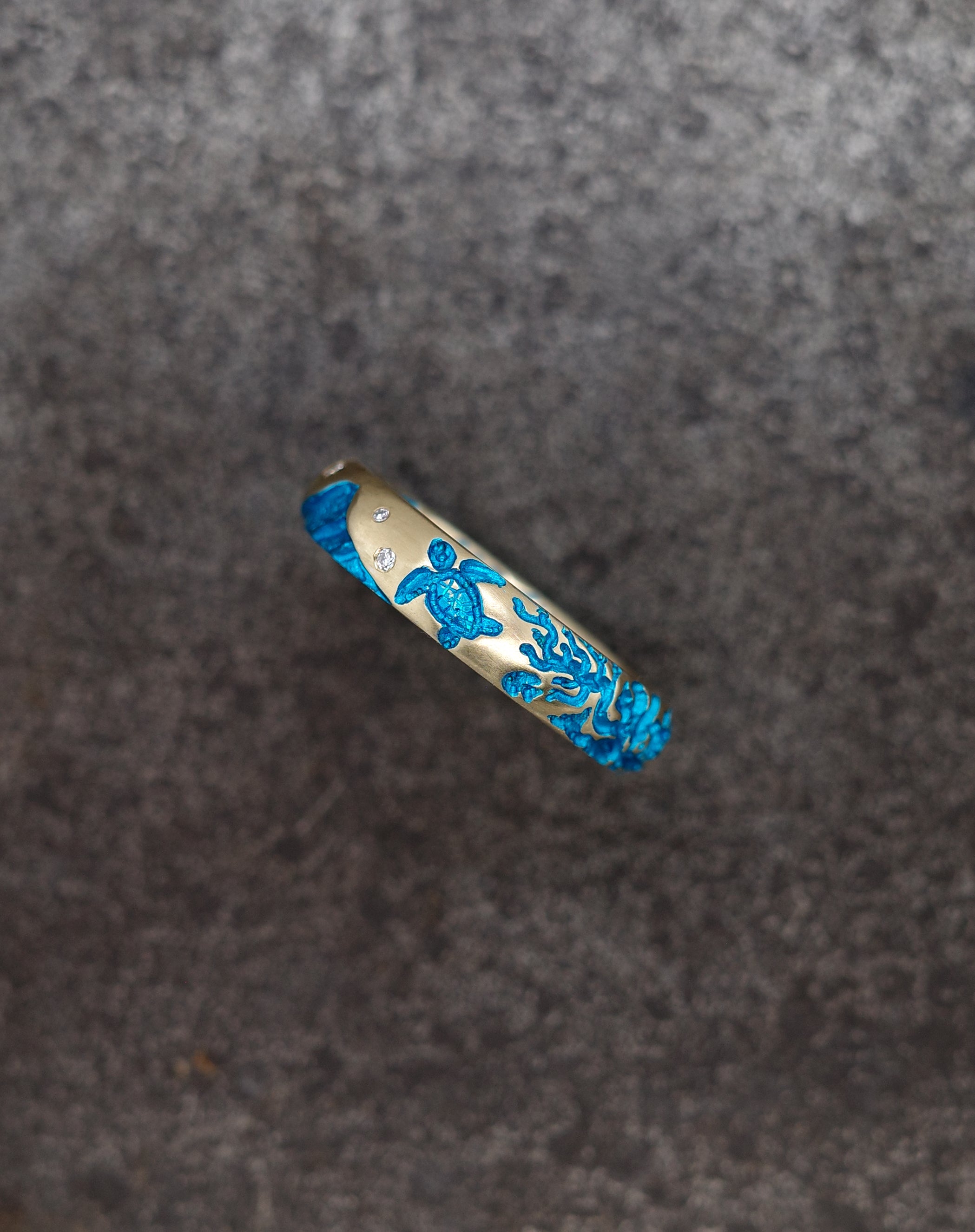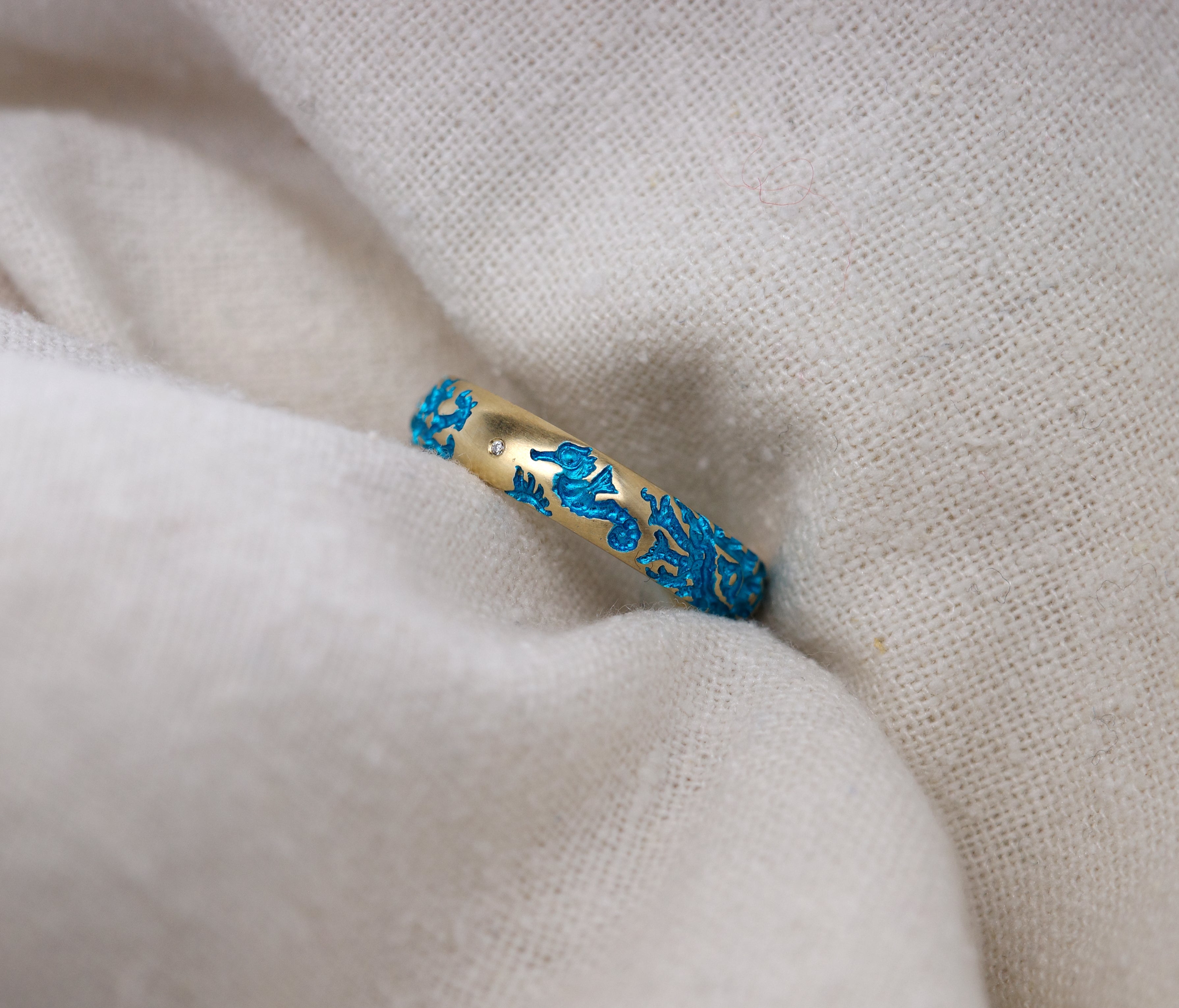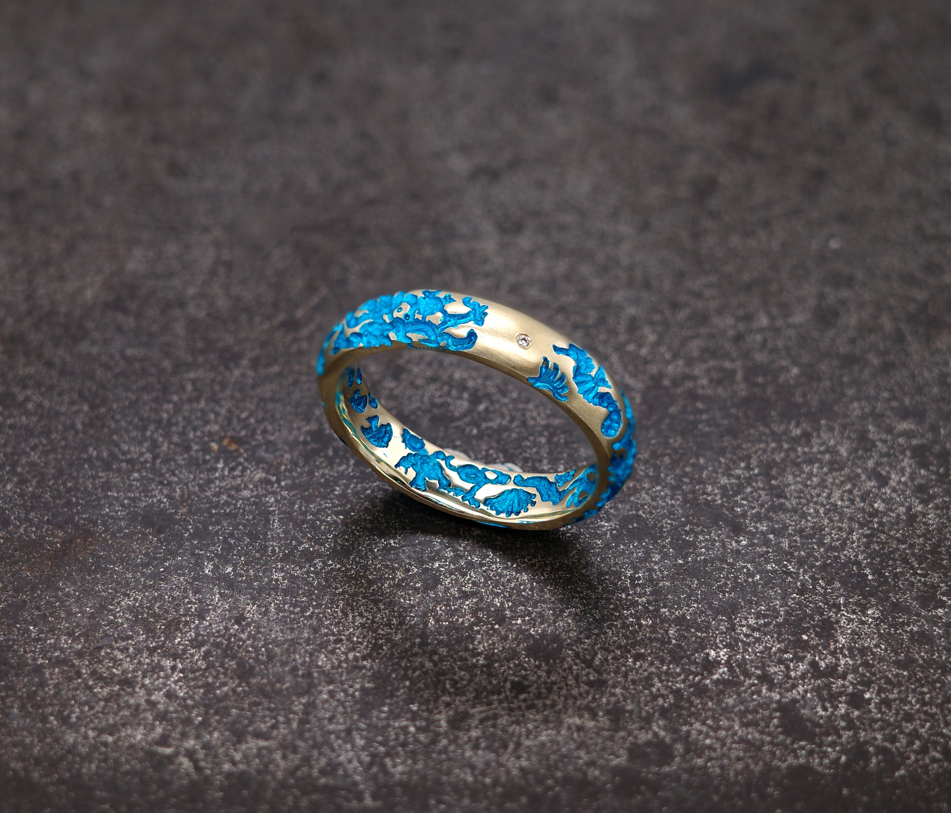 Hand-engraved with intricate coral motifs, this wedding band captures the fluid beauty of the sea. Deep-cut details add rich texture, creating a natural, organic feel against the satin finished gold surface.