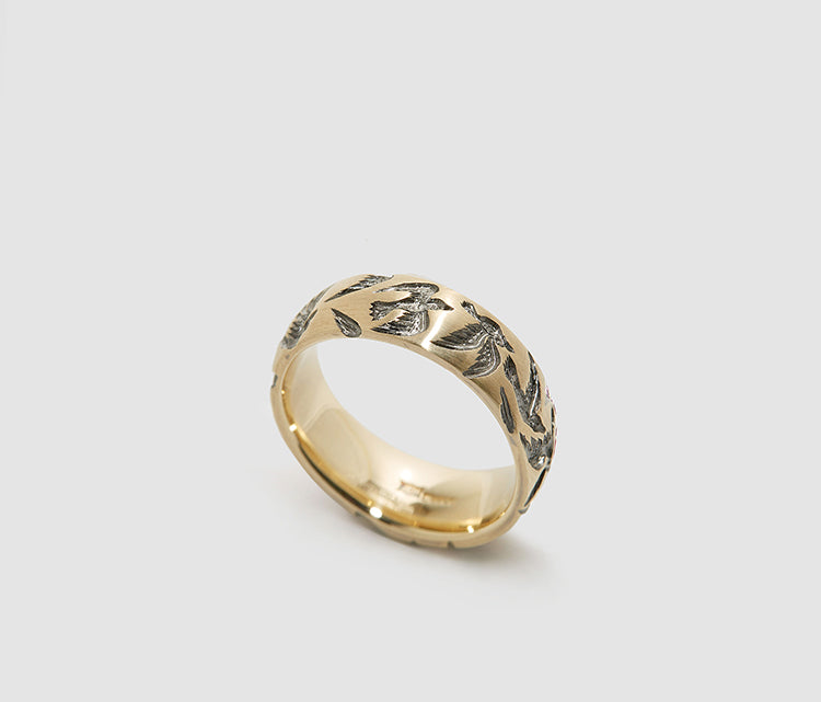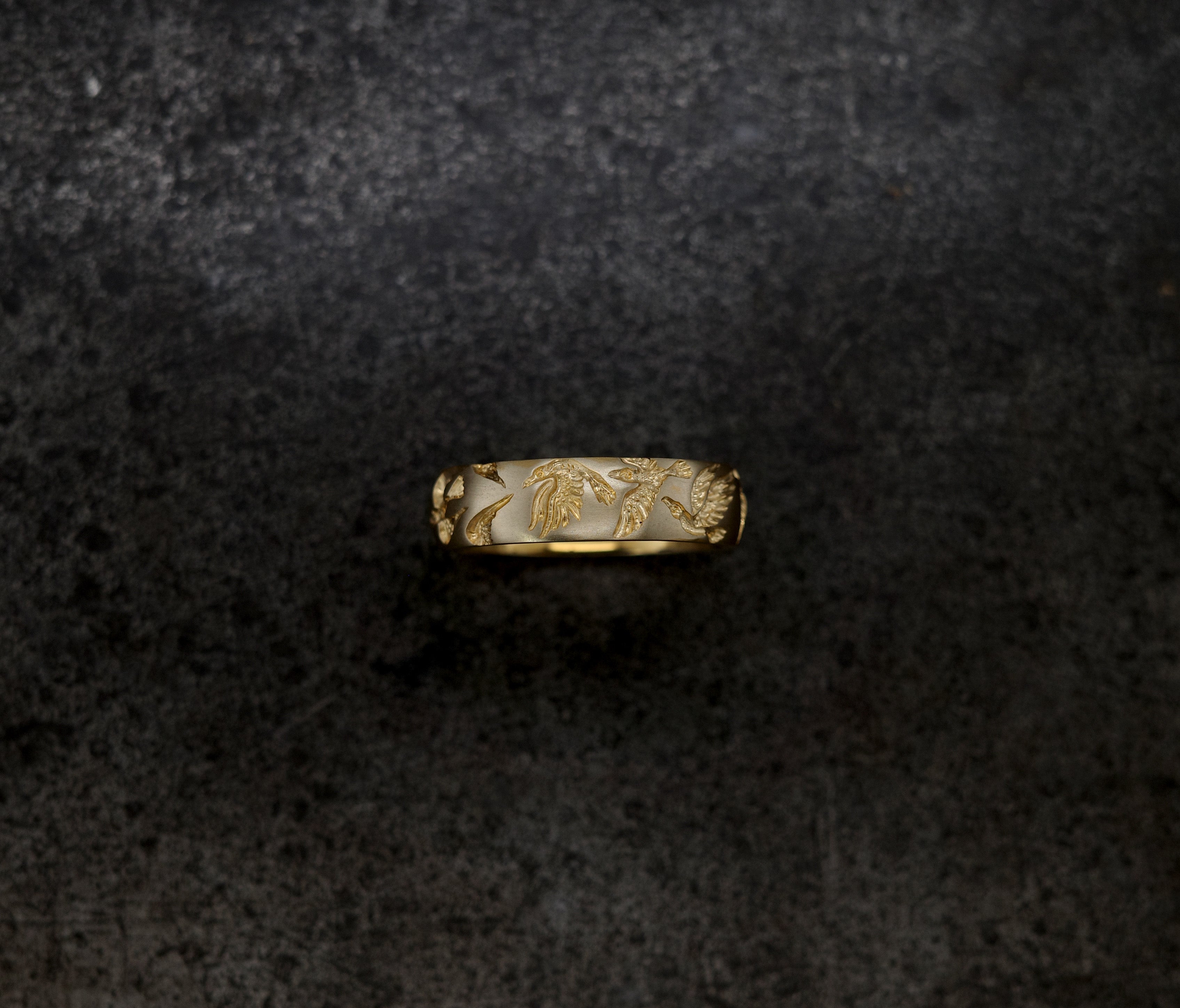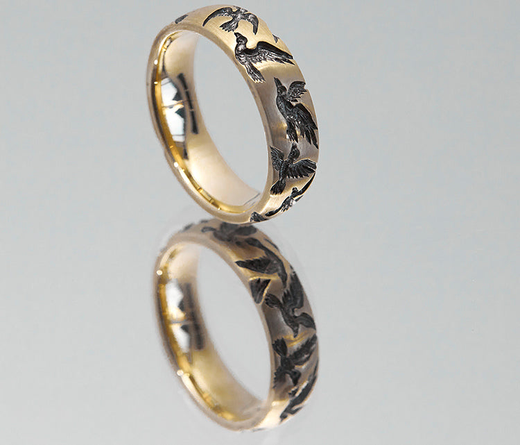 The Crebain crows, among my favourite of the Corvid species. The Flying Bird band ring features intricately hand-engraved birds in mid-flight, encircling the band seamlessly.