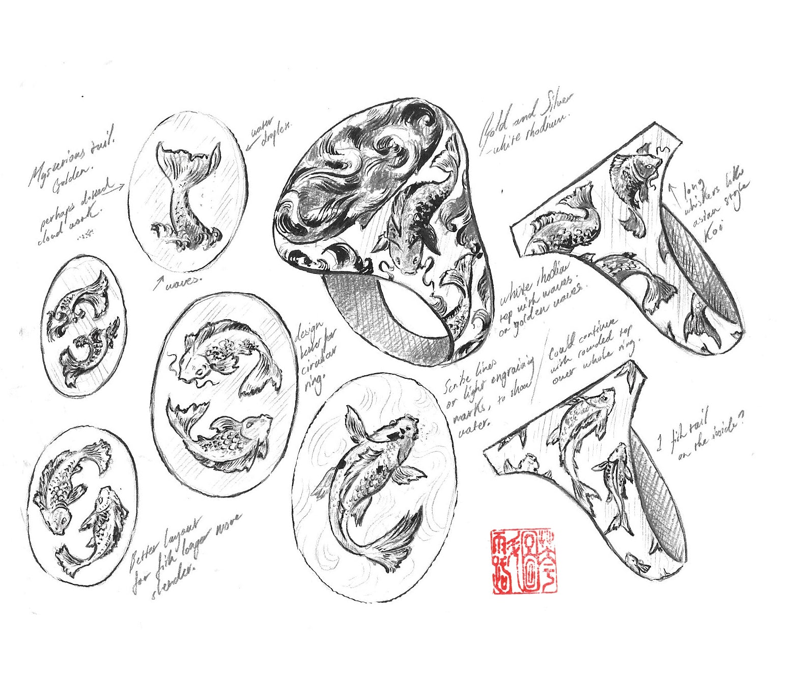 The Cyprini embody balance, their ripples of consciousness guiding us to a serene lake within the mind. The movement of their scales and patterns captivates and mesmerises, offering a tranquil refuge for thought and reflection. This piece features diamond eyes, with the fish gracefully circling a diamond pool on the face of the ring.