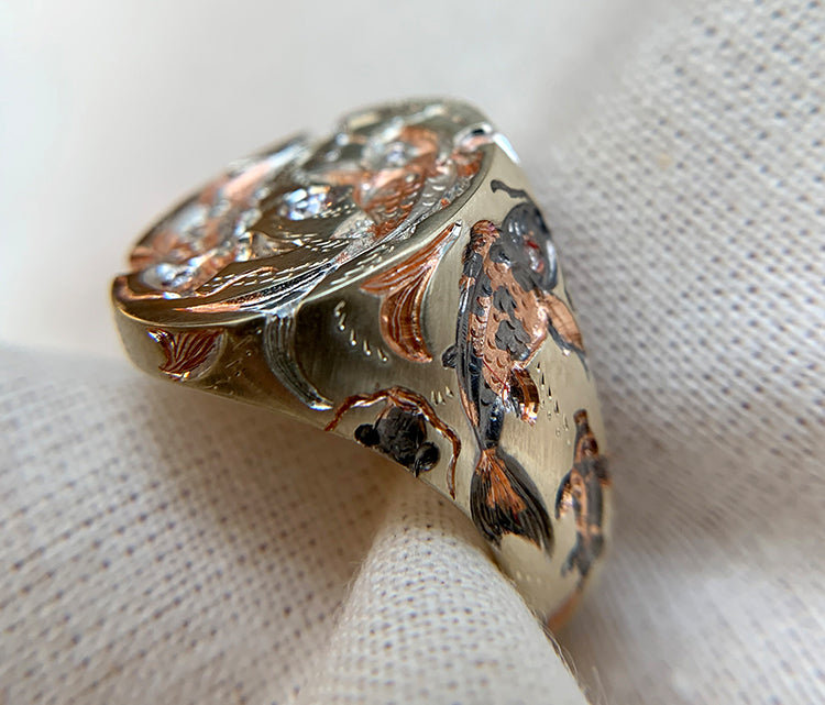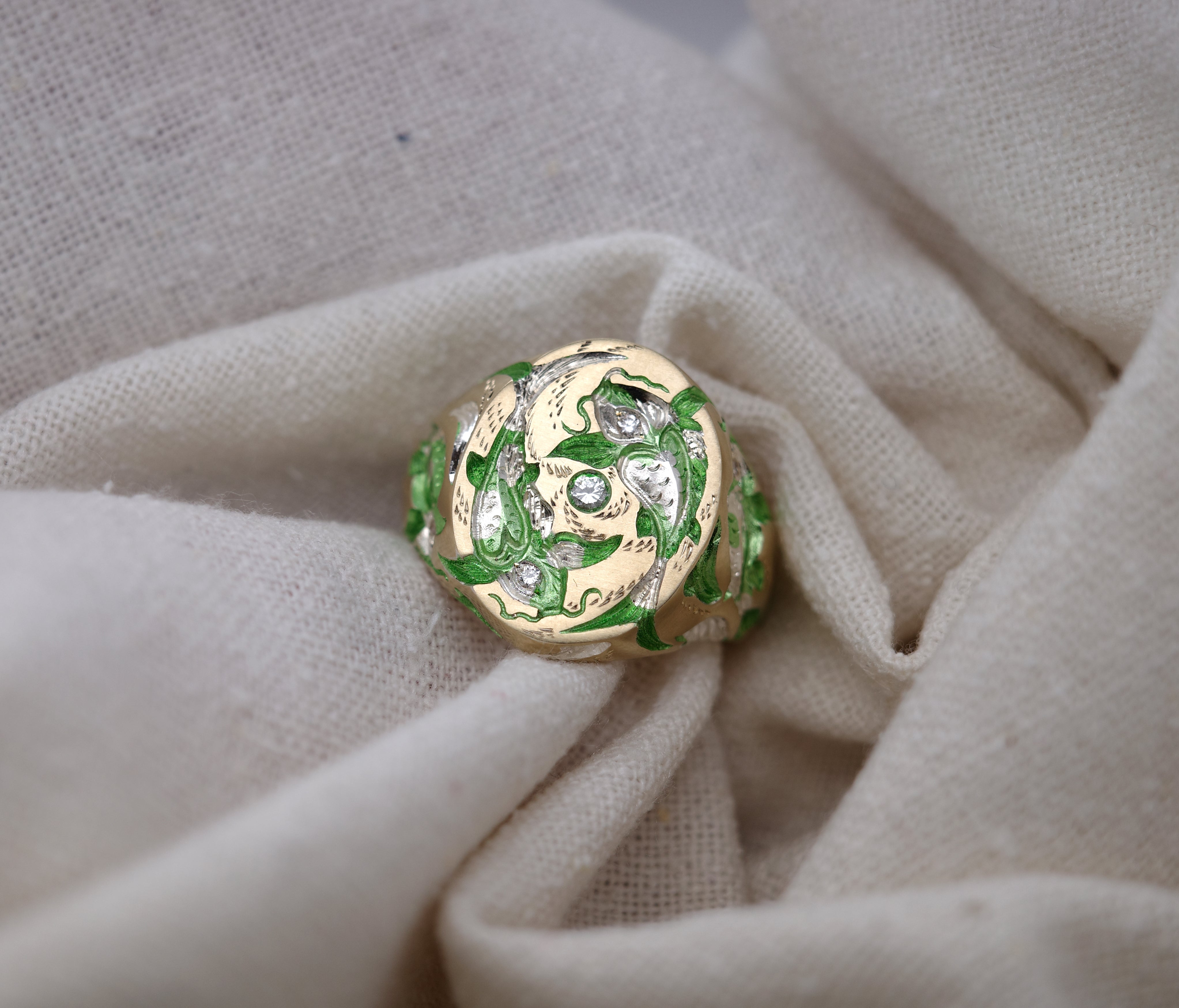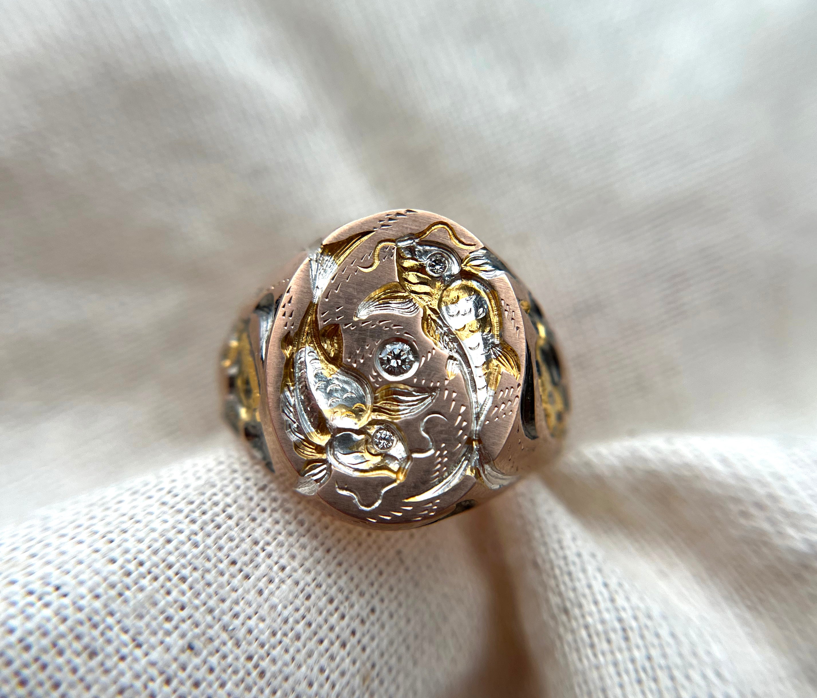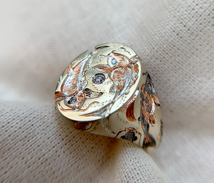 The Cyprini embody balance, their ripples of consciousness guiding us to a serene lake within the mind. The movement of their scales and patterns captivates and mesmerises, offering a tranquil refuge for thought and reflection. This piece features diamond eyes, with the fish gracefully circling a diamond pool on the face of the ring.
