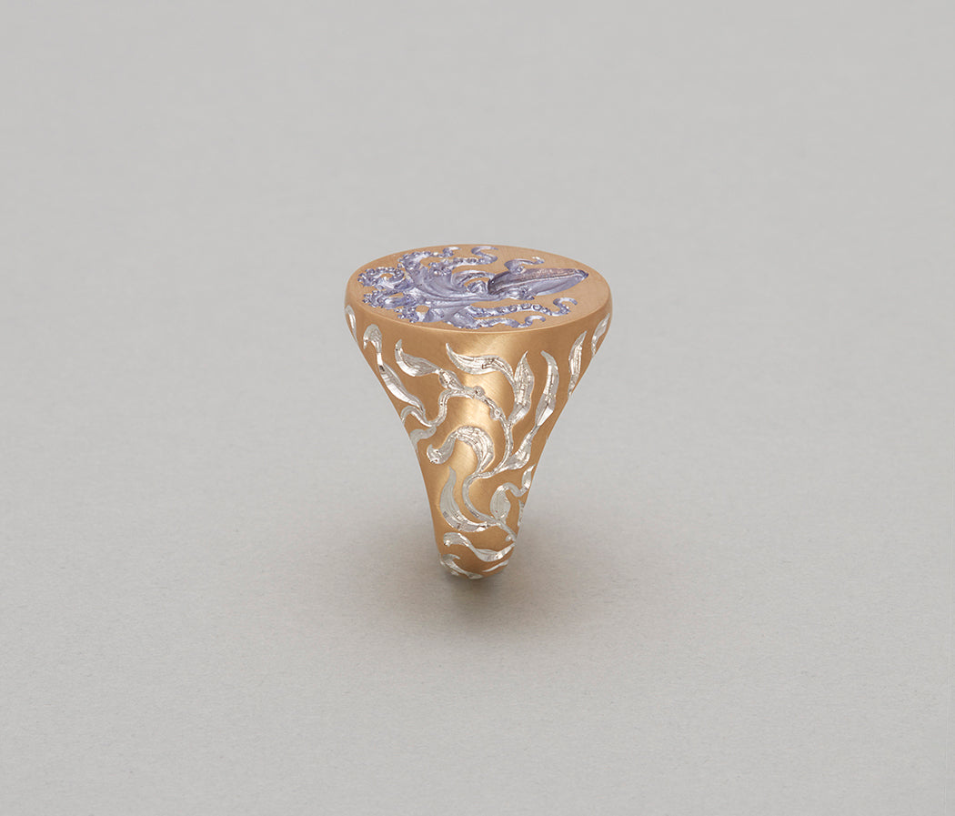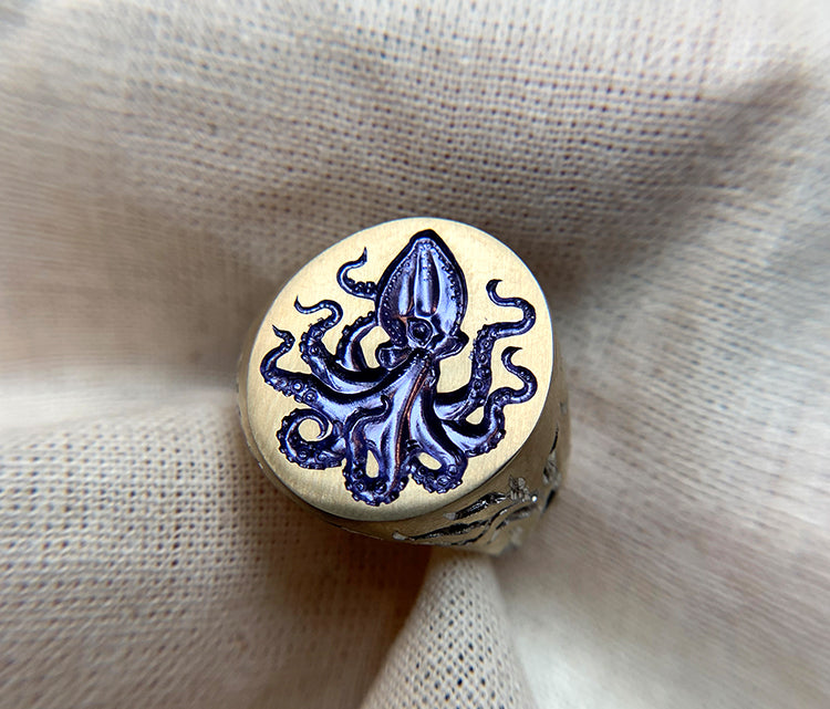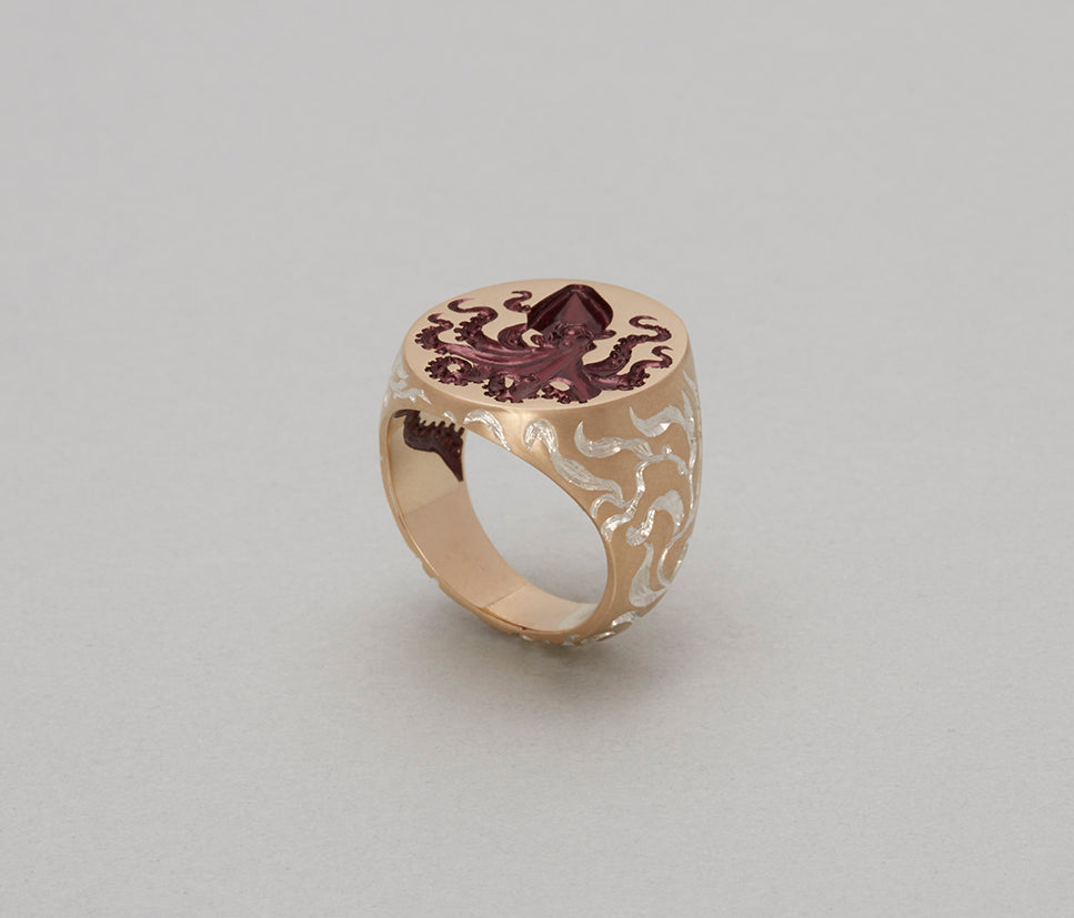 Inspired by Peter Godfrey-Smith's Other Minds. We find our-minds not too different from another and yet otherworldly. This one is for our mavericks and intelligent weirdos. This signet ring features a hand-engraved octopus on its face, with one of its tentacles extending onto the inner band. Hand-engraved seaweed elements gracefully climb up the sides of the ring, adding an intricate maritime.