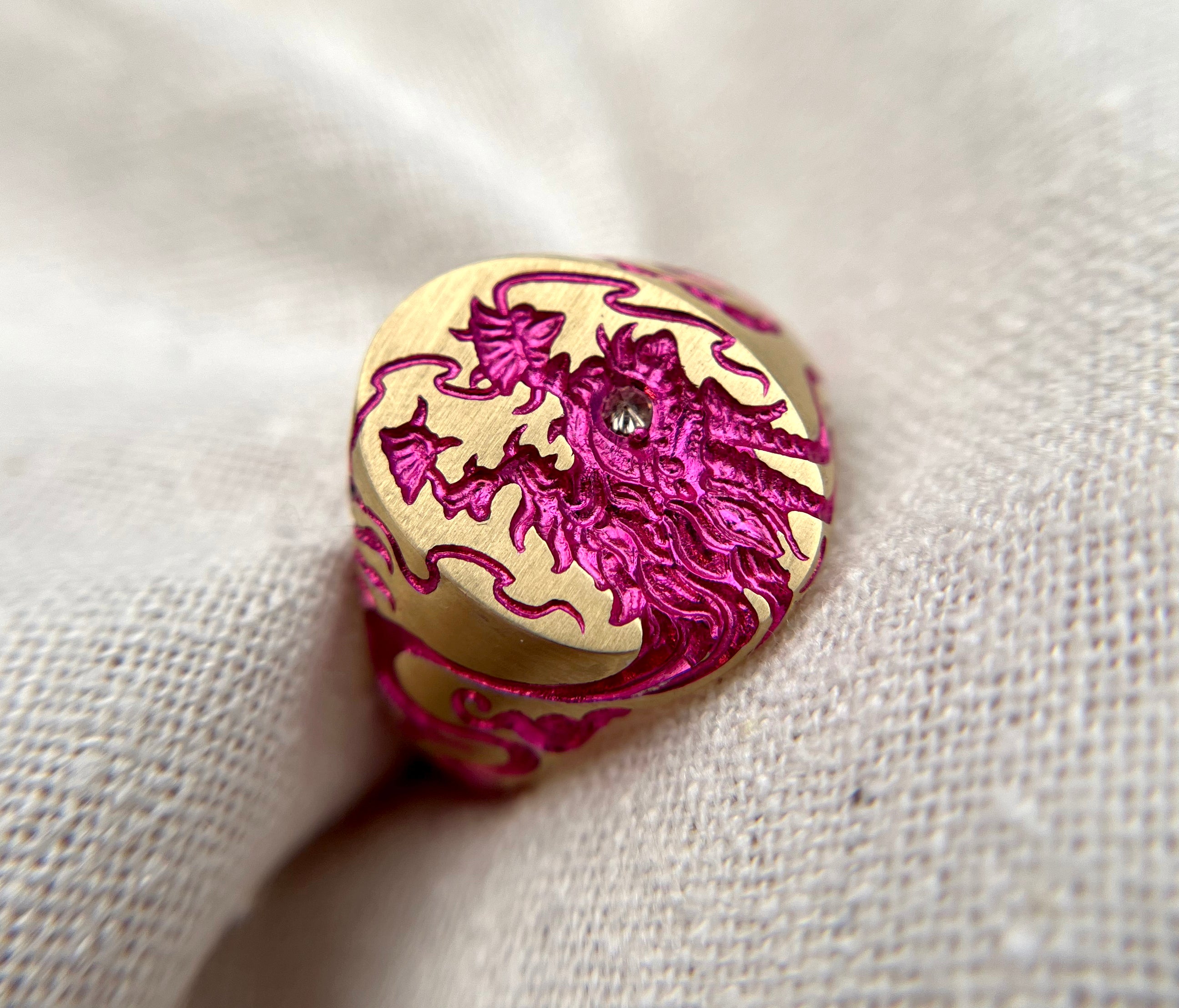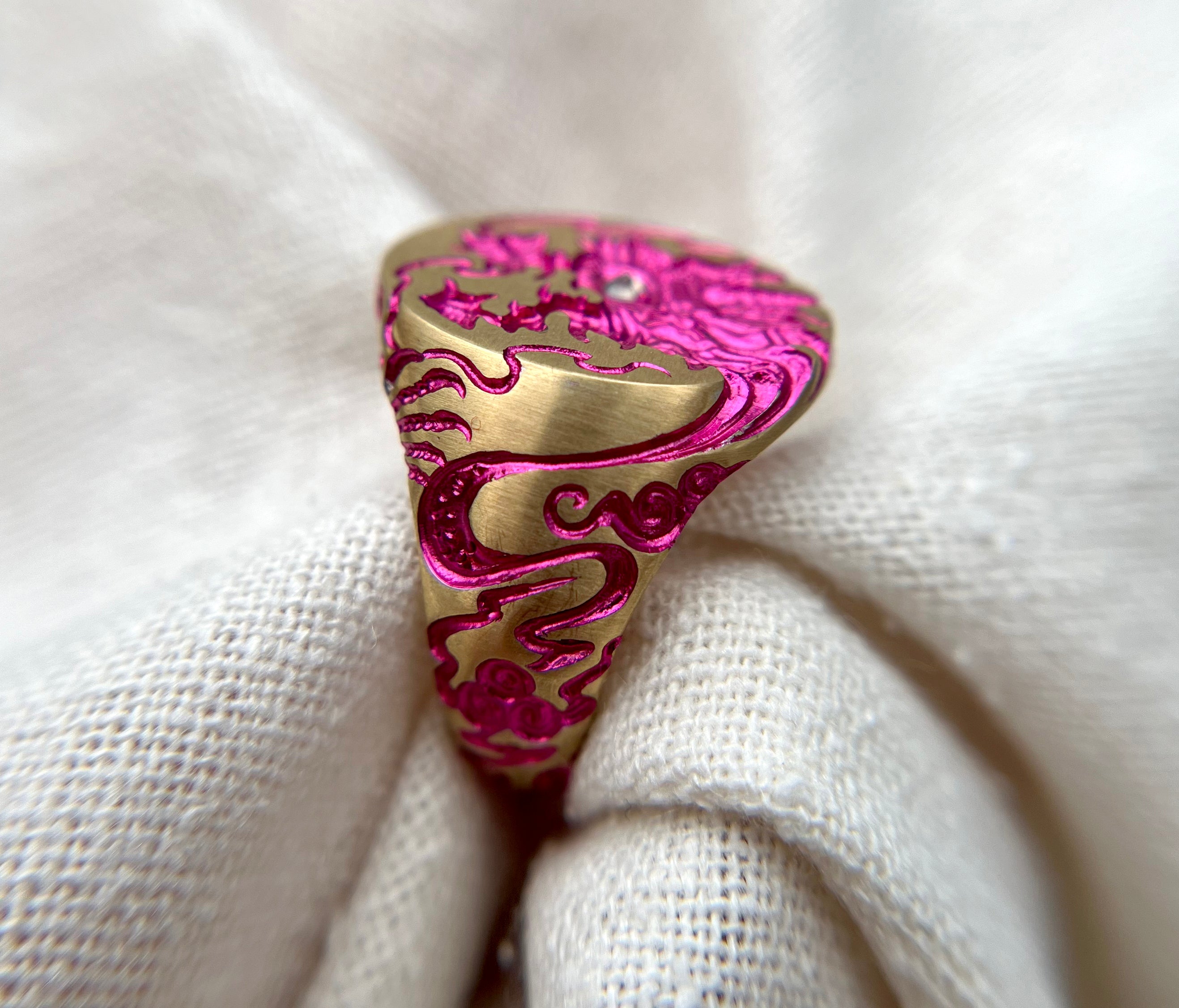This hand-engraved signet ring features an ethereal dragon, embodying the vibrant energy of spring and the prospect of new beginnings. Its eye, set with a sparkling diamond, winks at you in moments when you need a brush of luck.