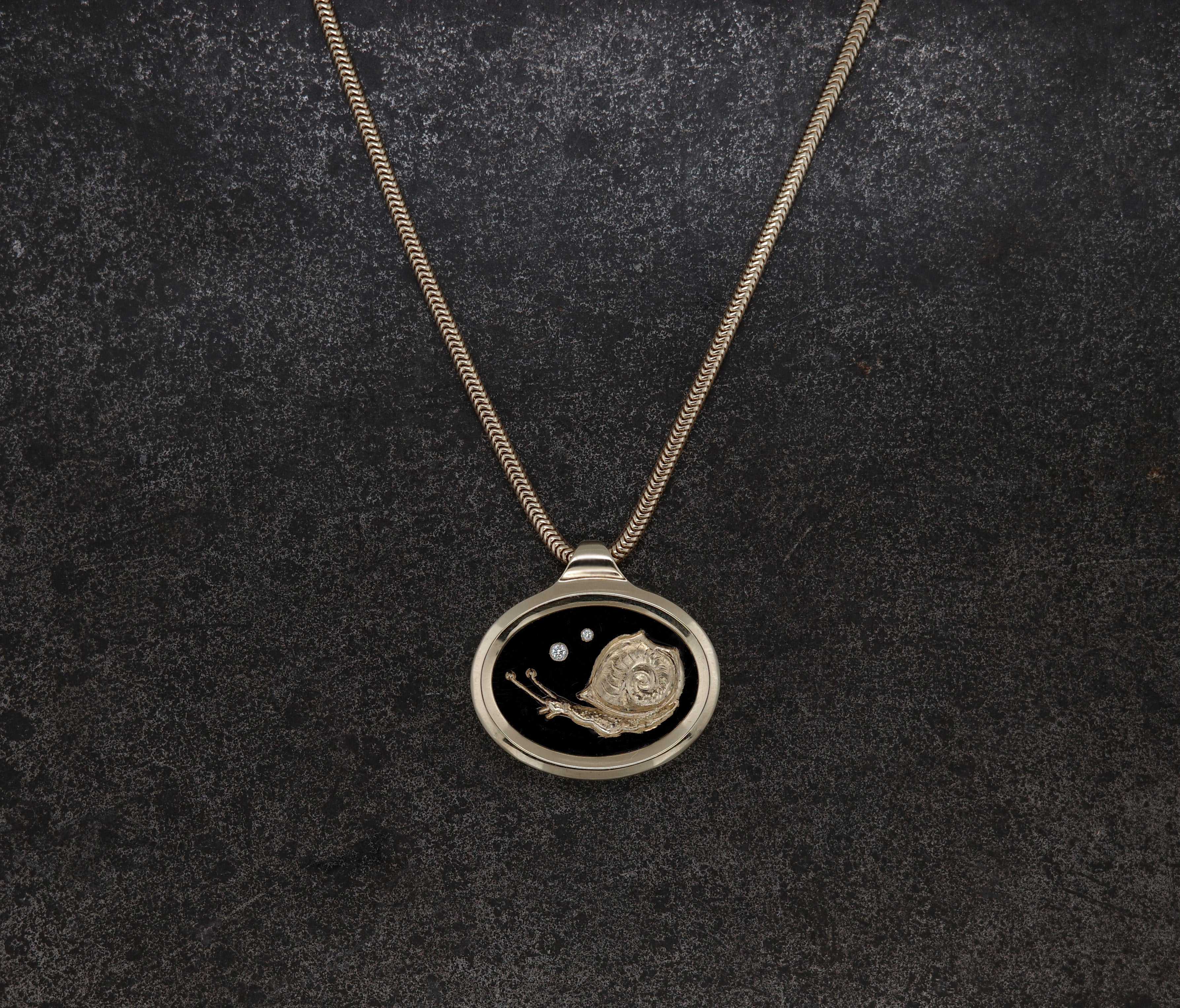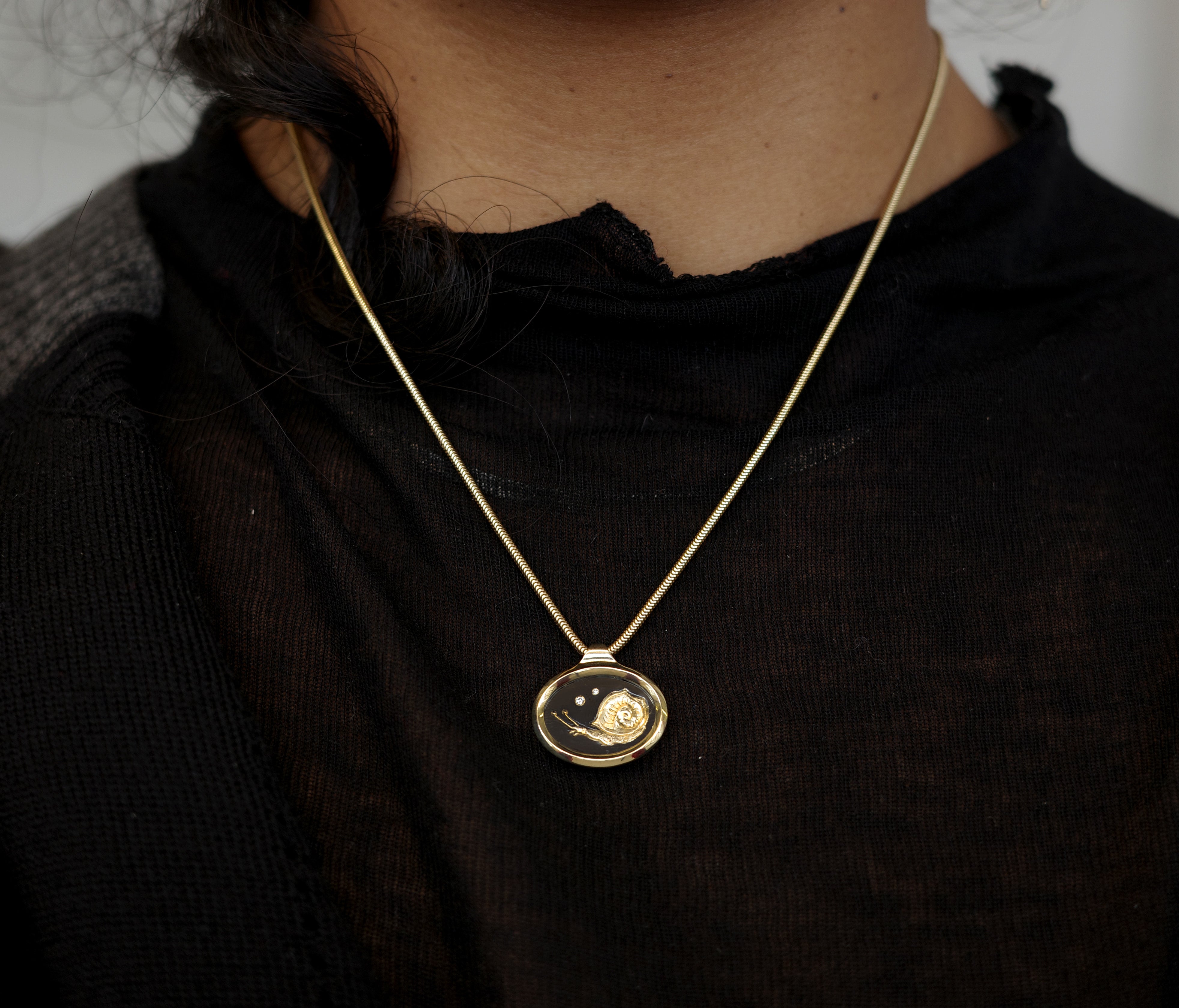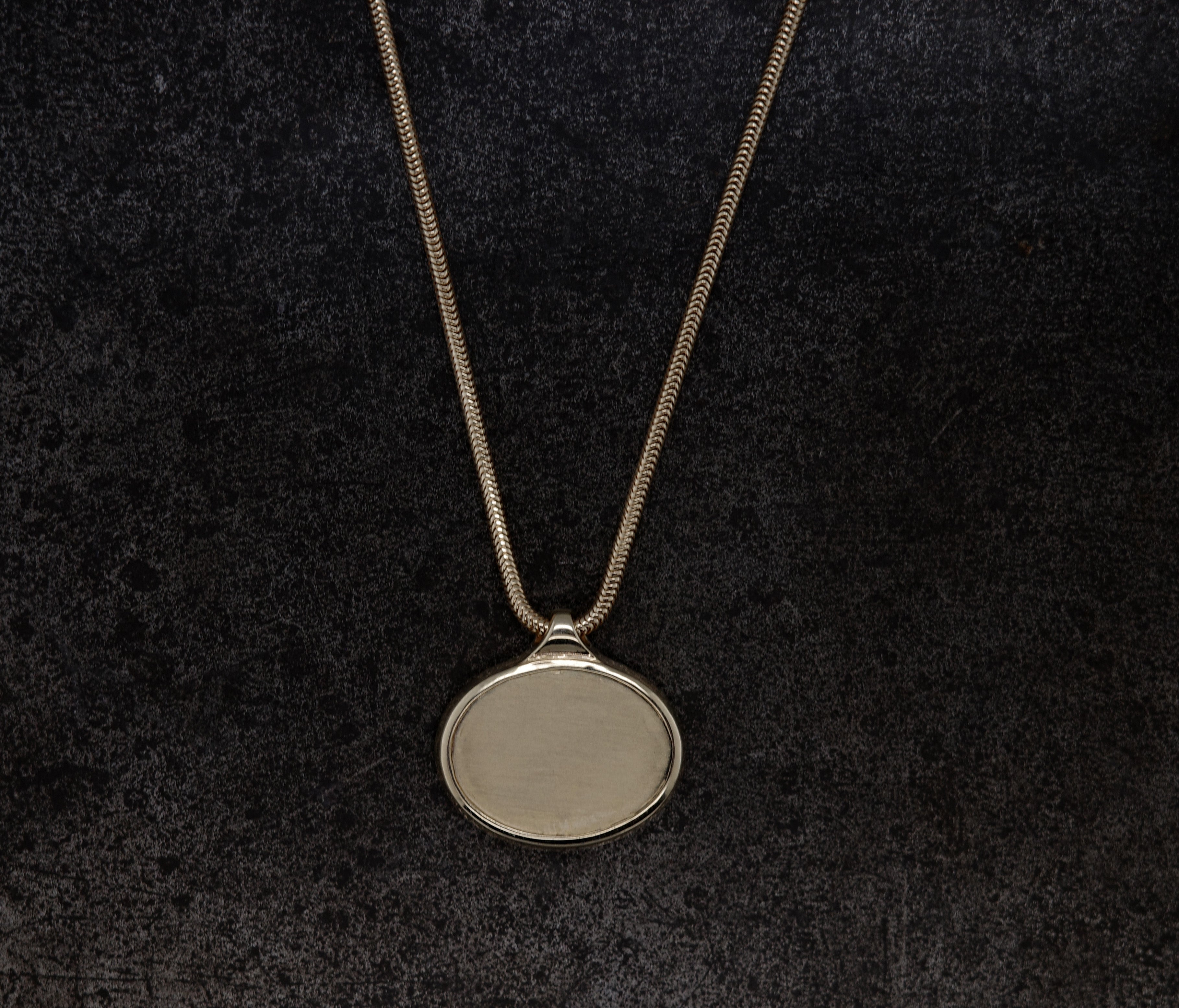 Carved into gold with Japanese black plating. Set within a gold frame with space on the back for a special inscription. 18 inch round snake chain.
