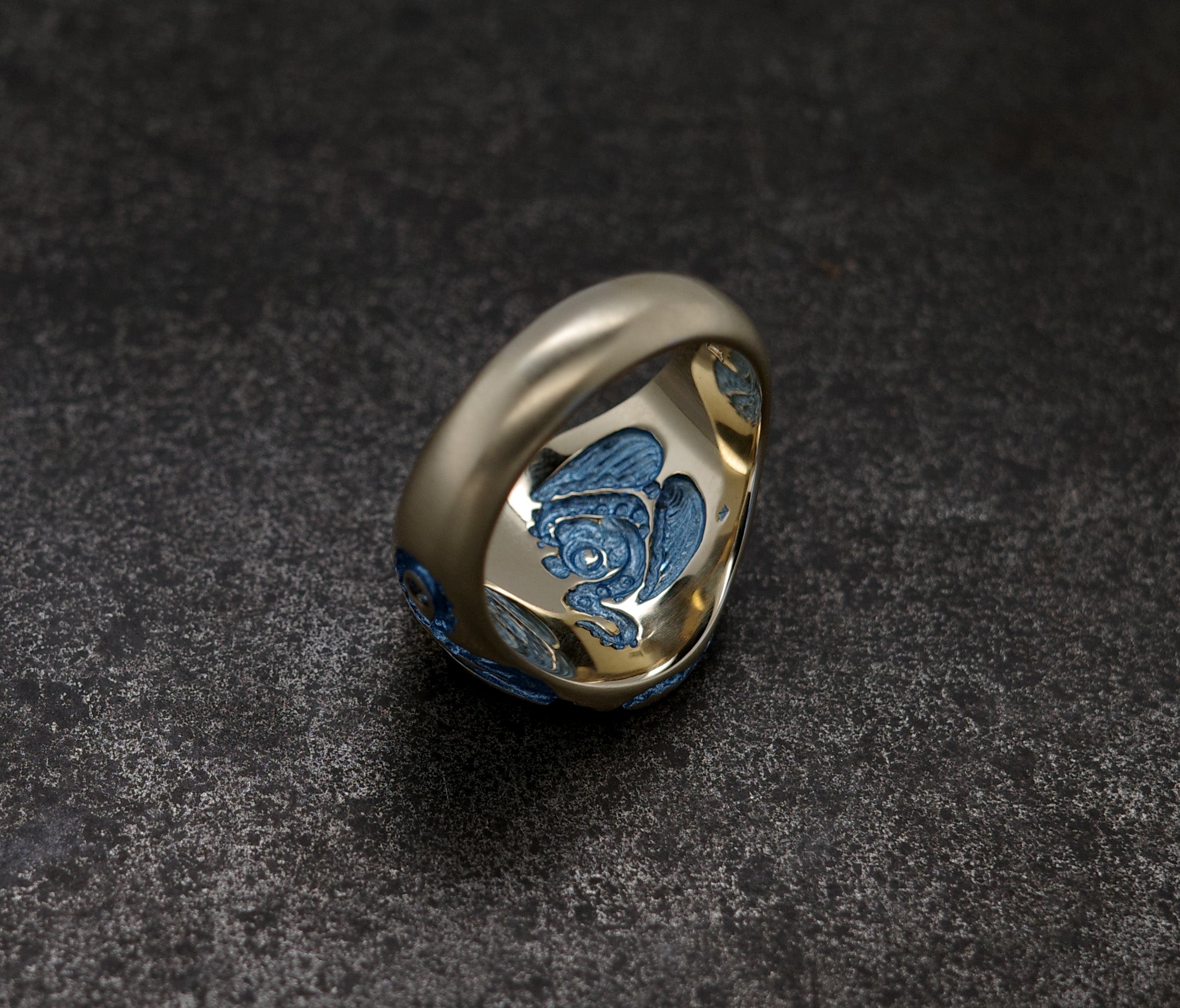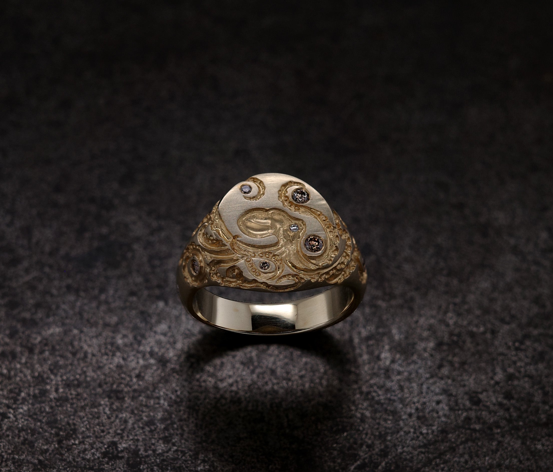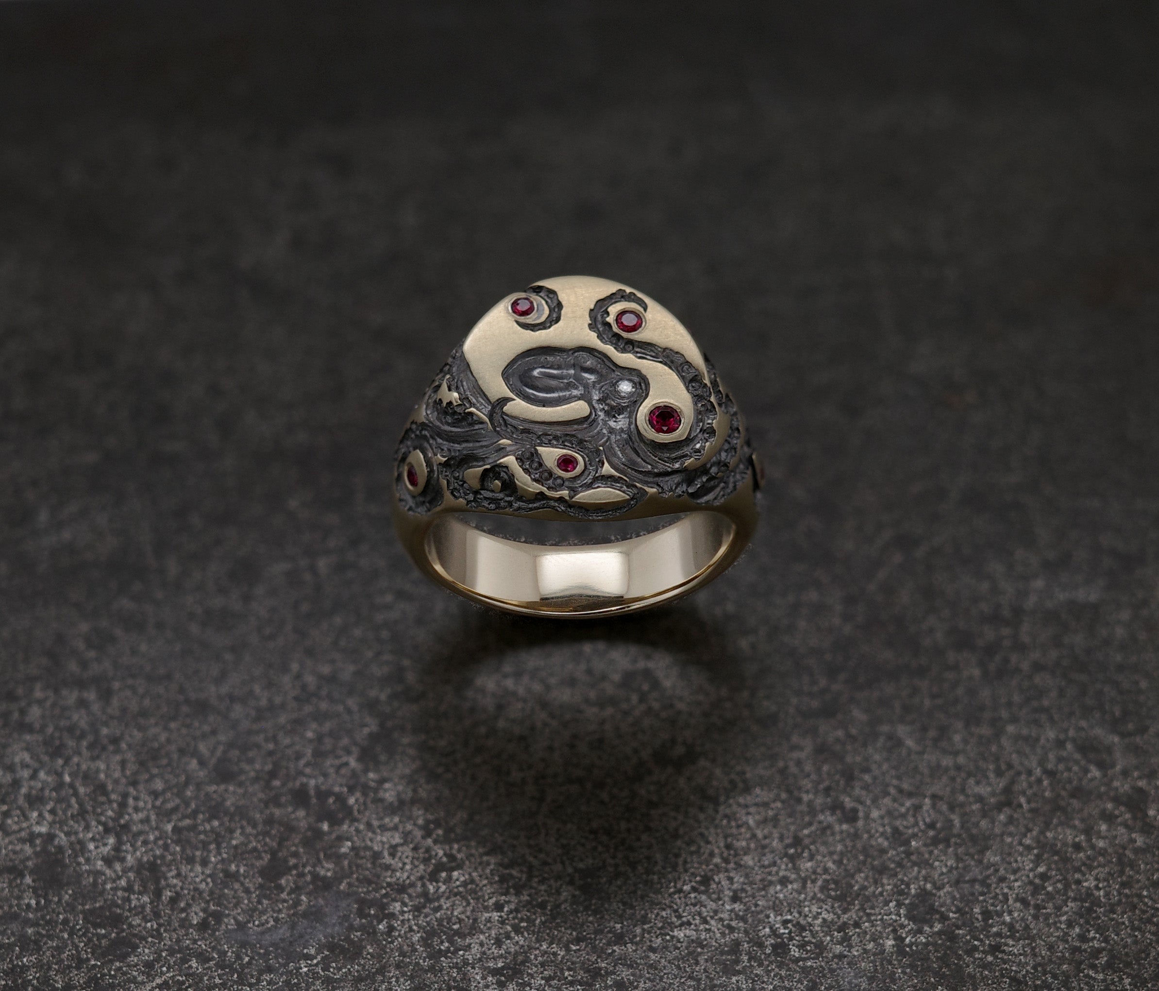Inspired by Peter Godfrey-Smith's Other Minds. We find our-minds not too different from another and yet otherworldly. This one is for our mavericks and intelligent weirdos. This signet ring features a hand-engraved octopus on its face, with tentacles reaching across the sides of the ring, juggling rubies and diamonds on all 8s. Inside, it takes refuge in an oyster shell ahead of the long night.