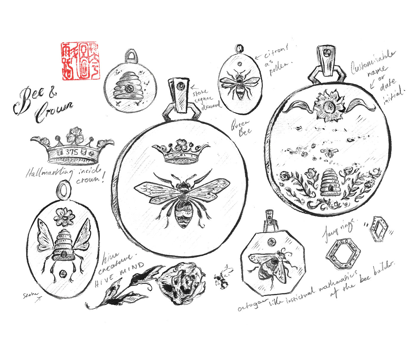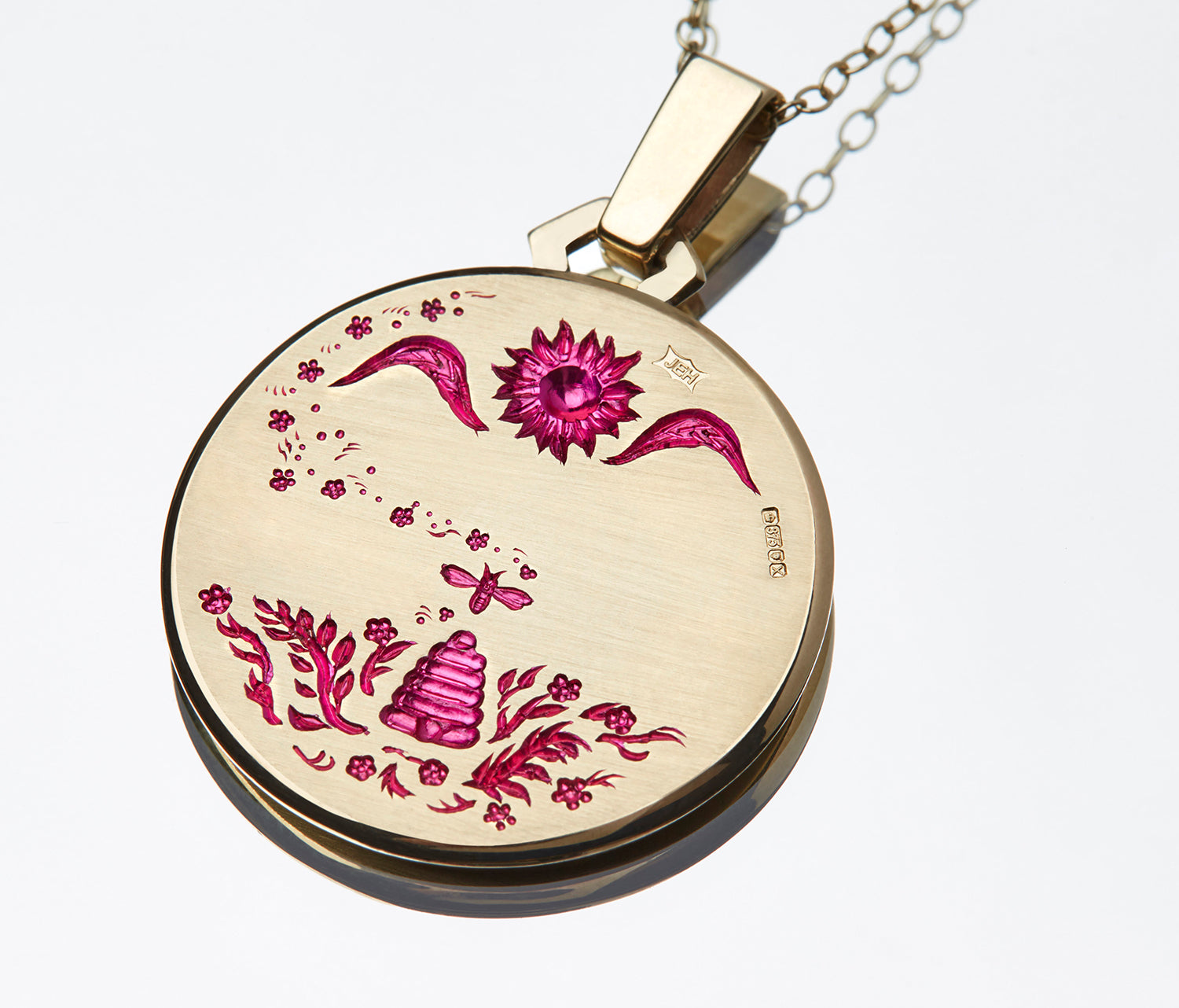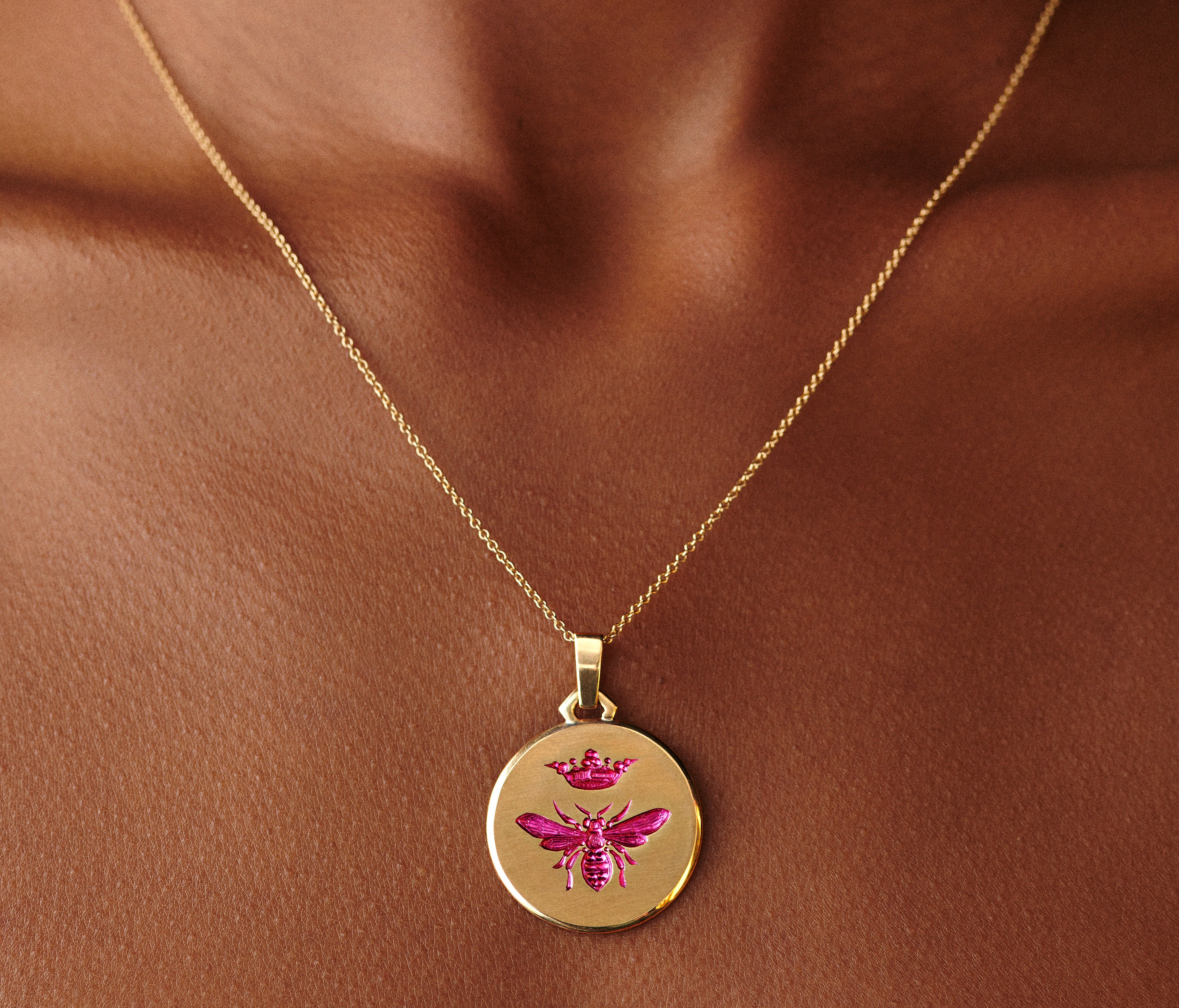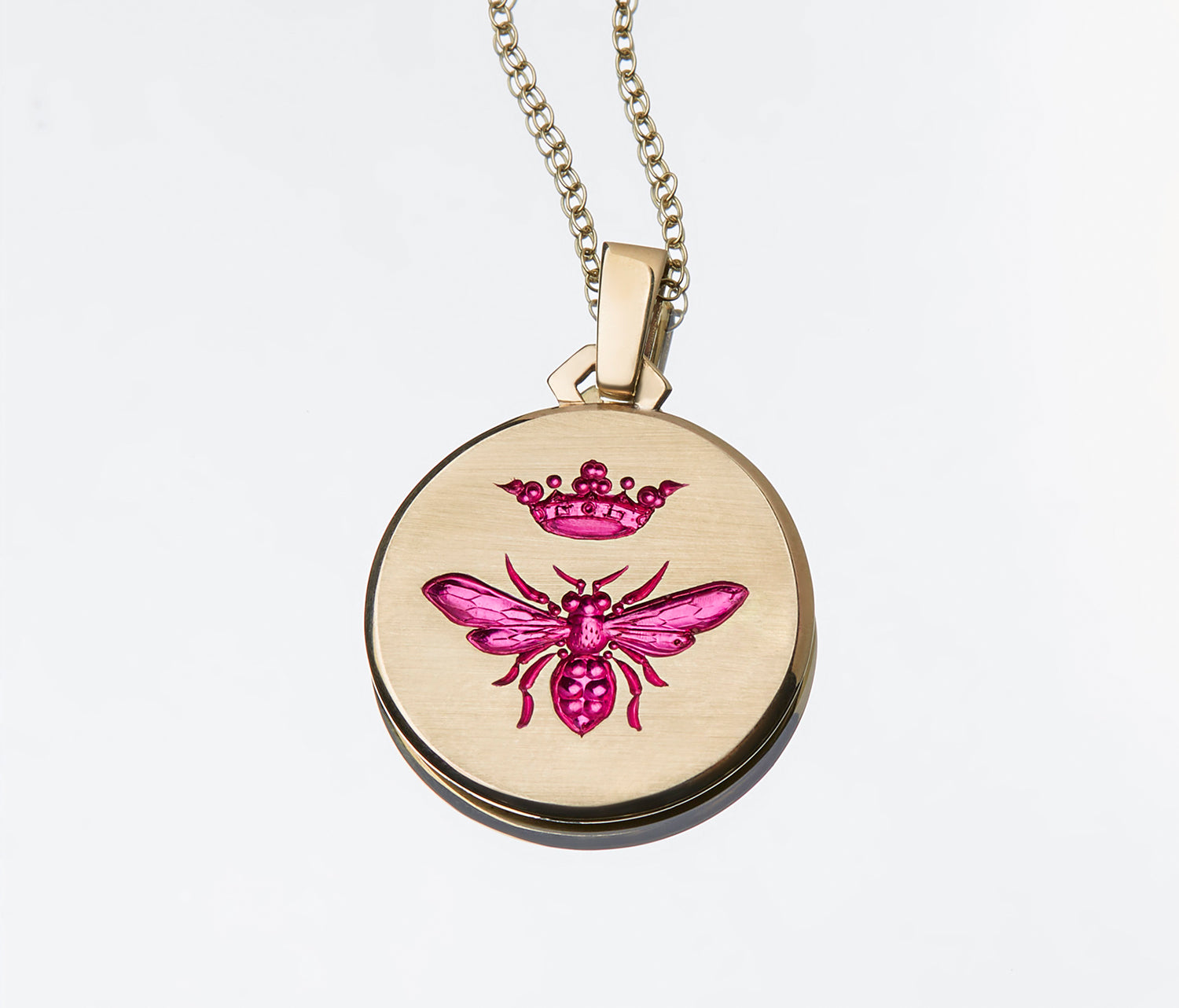 This intricately hand-engraved Queen Bee Pendant features a bee and a crown on the front and a hive and sun on the reverse. The pendant has a space on the back for a personal inscription.