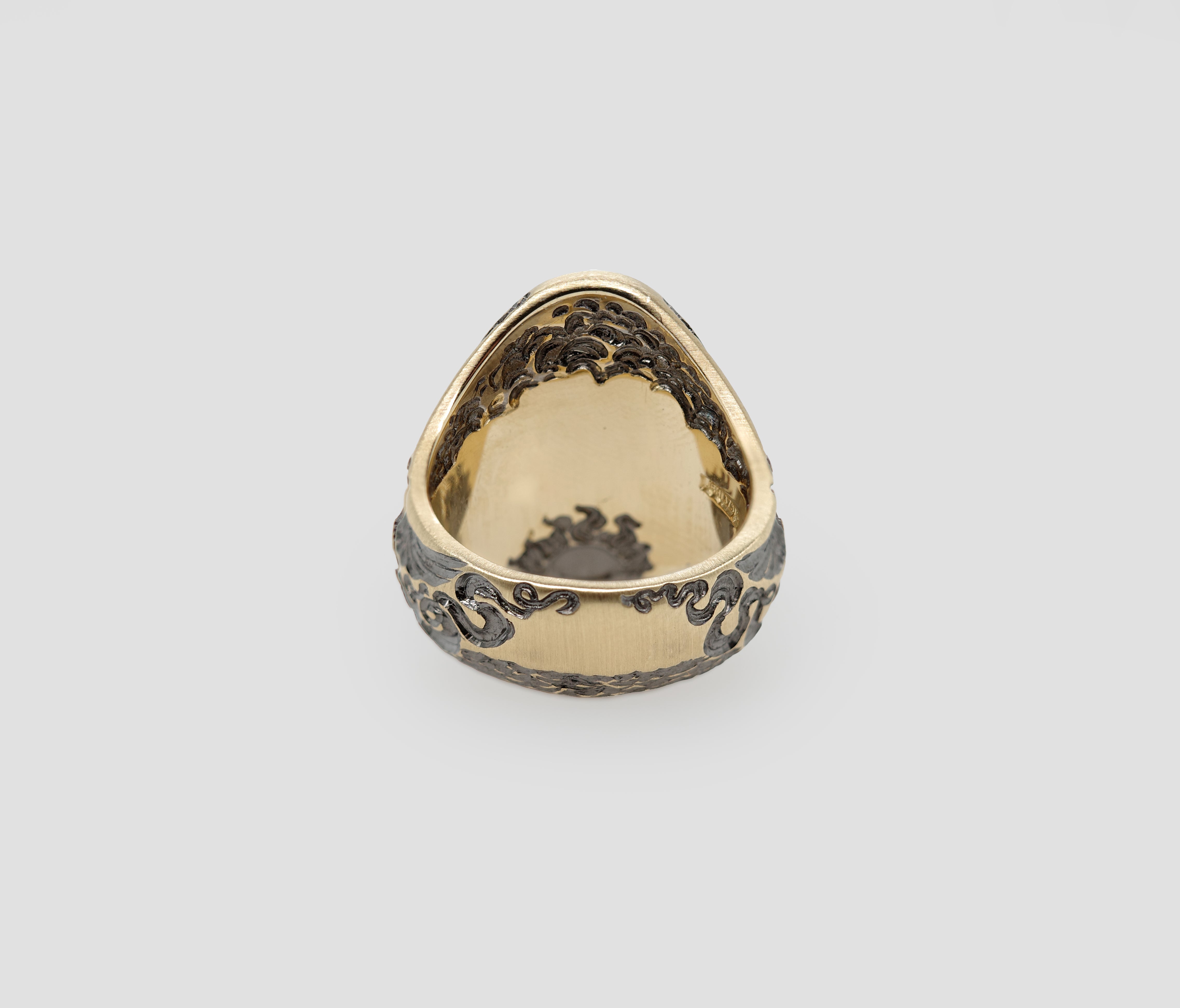 The call of the sirens beckon the Royal Galleon. Are you listening to the beauty of the song or being distracted? only the wearer knows. This mystical signet ring showcases a ship on its face, with sirens elegantly engraved along the sides, their forms flowing around the band. Hidden on the inner band is a beautiful sunrise over the water.