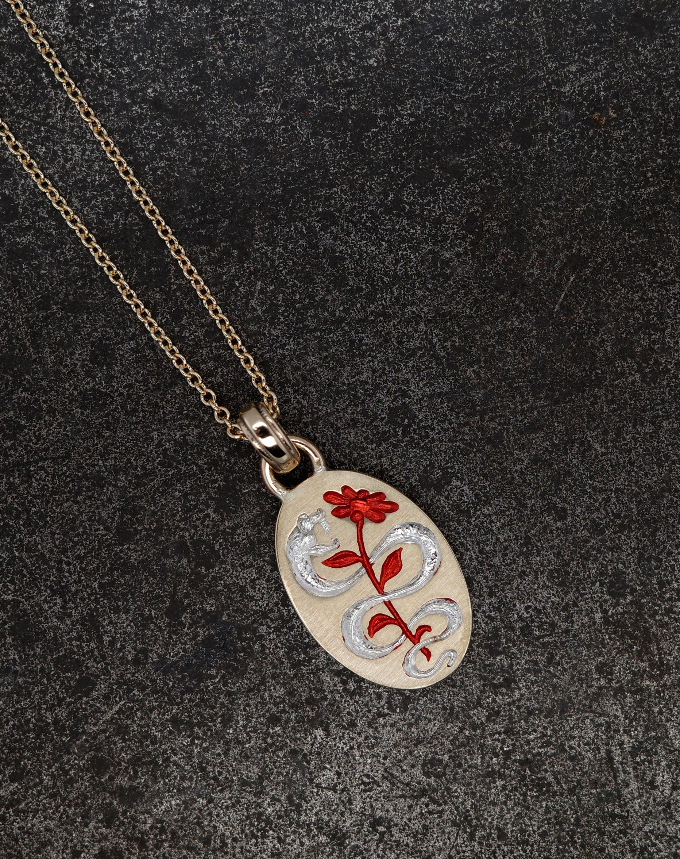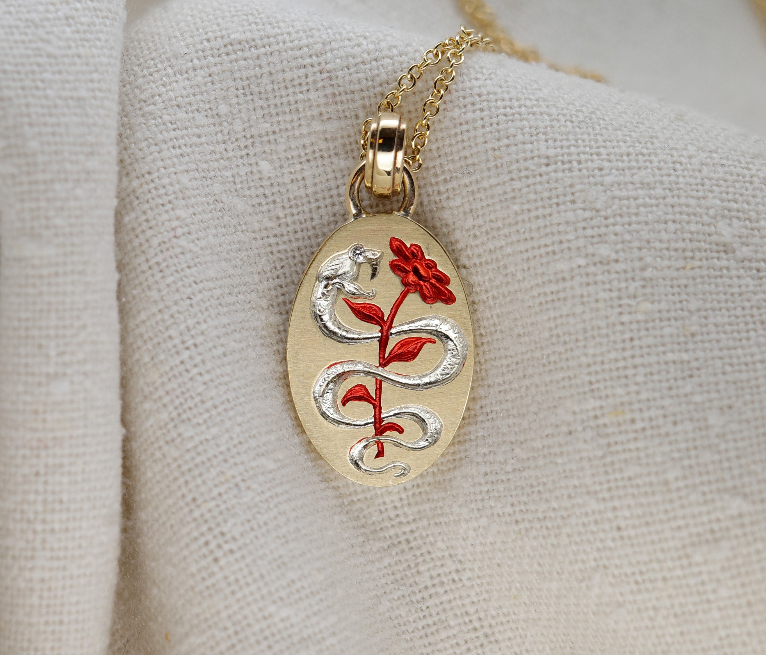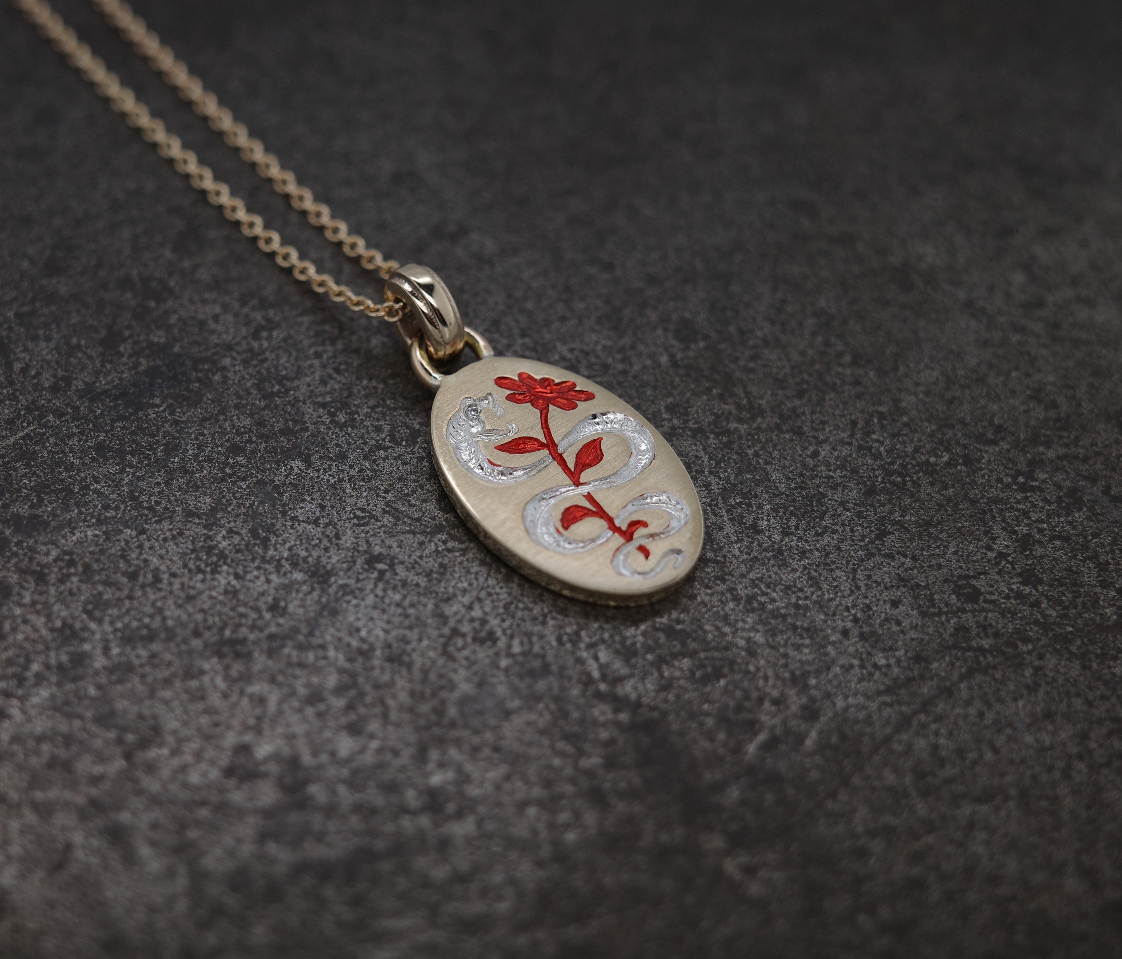 This pendant features a snake intertwined with a flower. The back of the pendant is left blank for a personal inscription.