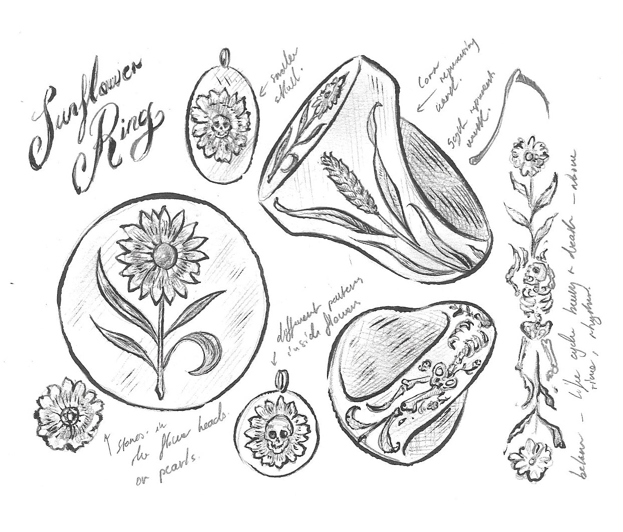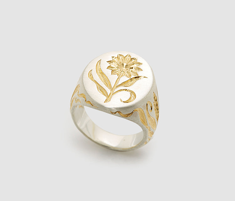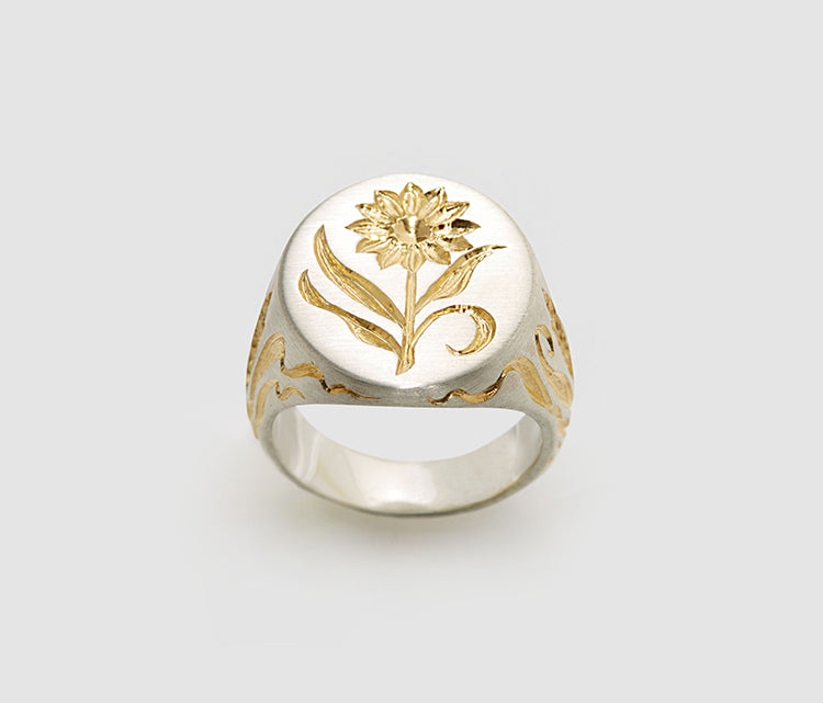The sunflower is the radiance of summer and the wheat sheaths are a symbol of bounty after hard work. This piece features a hand-engraved 18ct yellow gold plated sunflower on the face with delicately engraved corn crops elegantly grow up the sides from the skeleton at the lower part of the band.