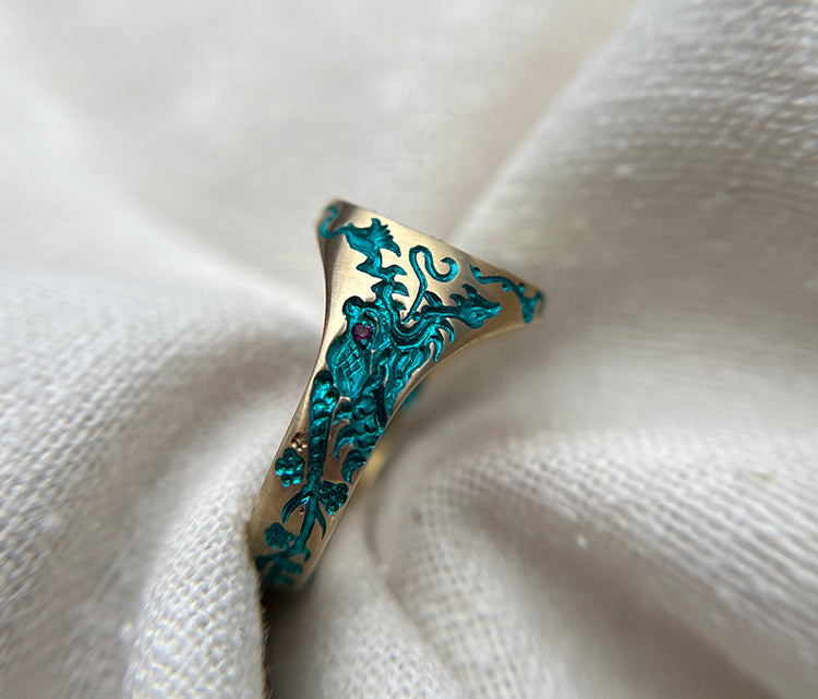 A claw of flowers and a claw with powers—this Dragon, deeply connected with nature, brings great luck and strength into the year. The ring is adorned with a diamond moon on its face, while a ruby-eyed dragon gracefully swoops around the circumference, infusing the piece with its powerful presence.