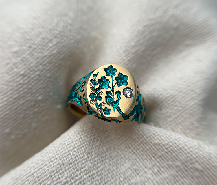 Your Castro Smith piece is crafted to last a lifetime. While fine jewelry is durable, it remains delicate and should be handled with care. Over time, your piece will naturally wear and evolve. This can include more visible engraving, slight darkening inside as it accumulates "life," and signs of normal wear such as scratches and small dents.