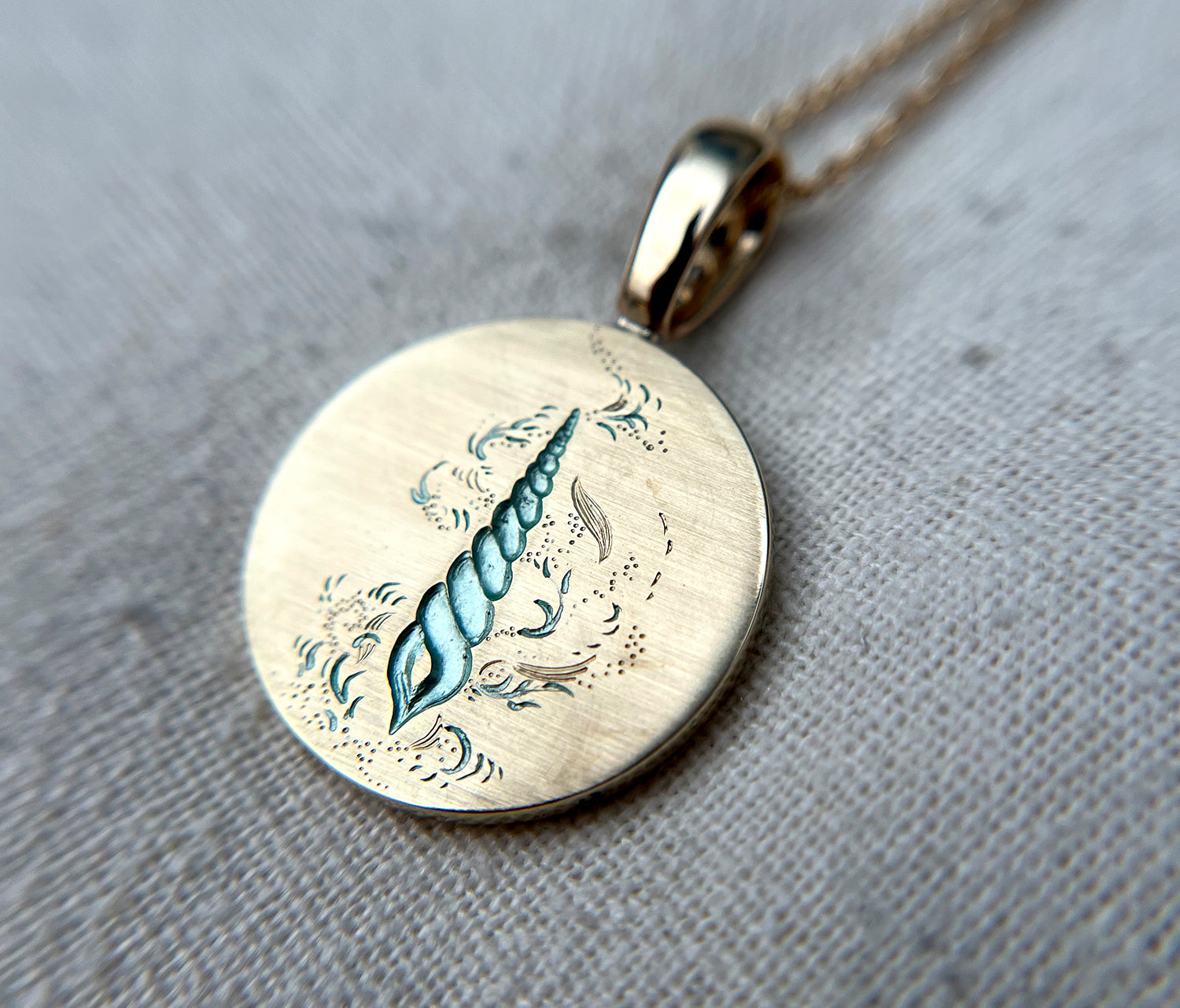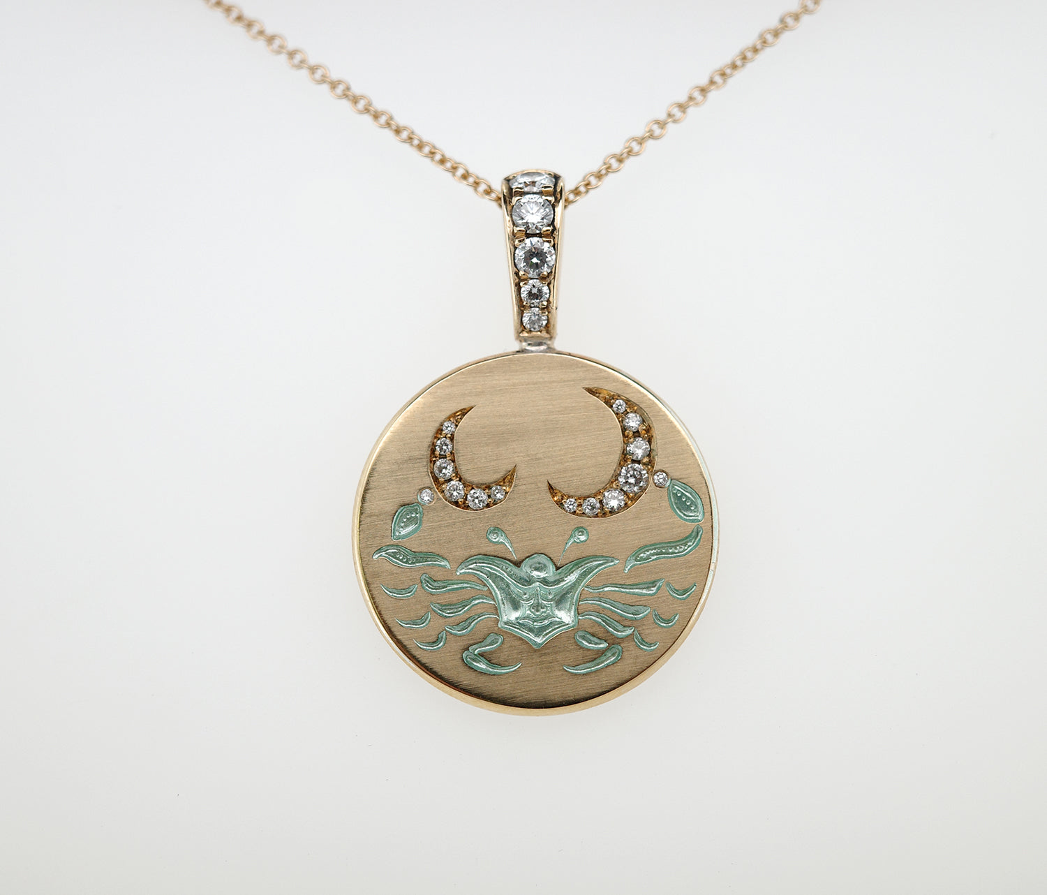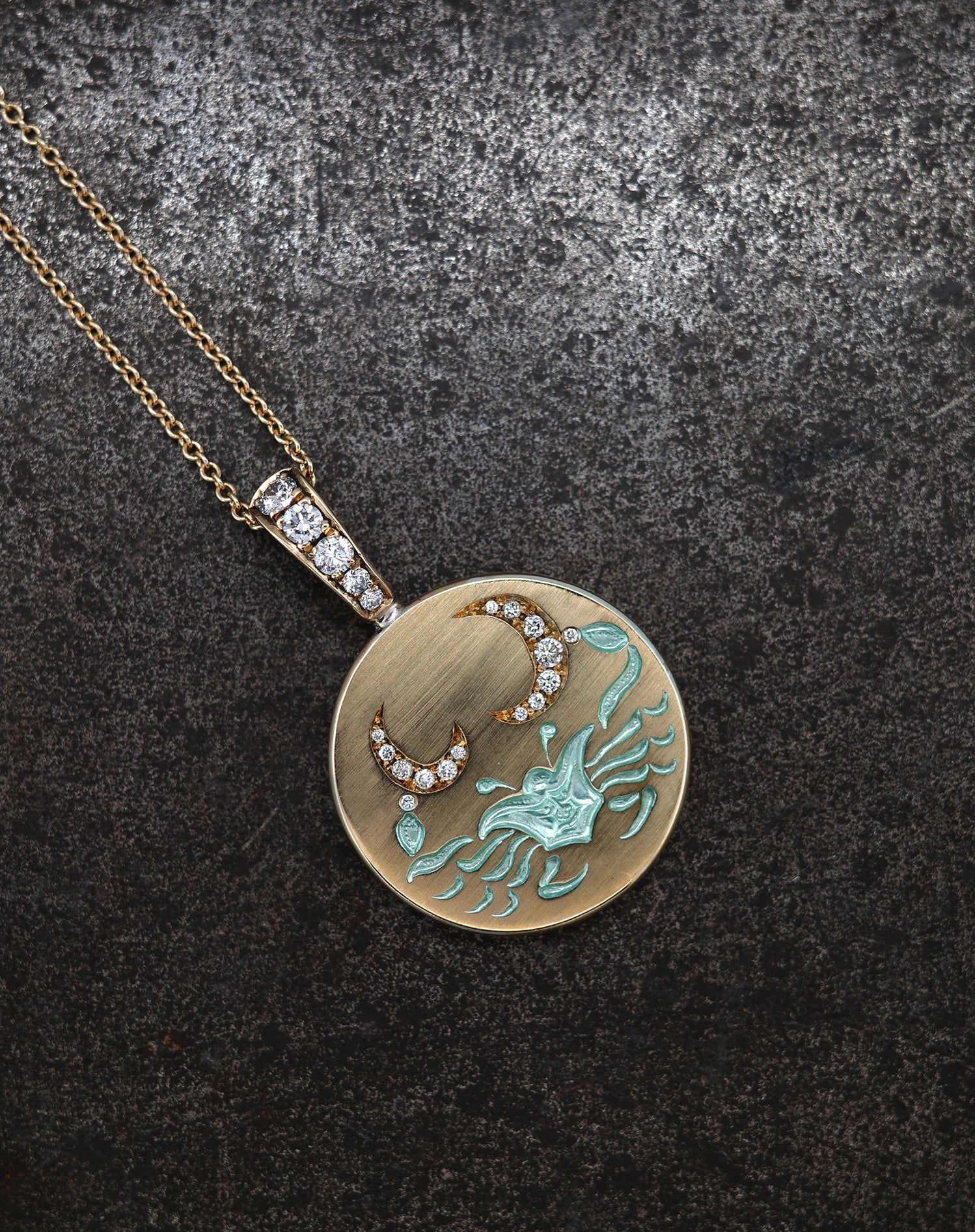 Bringing the bounty of the ocean and the gravity of its two moon claws over the tides, never has a crab been so confident to shed its armour. This pendant is adorned with a diamond bale and diamond claws, featuring a stunning shell detailed on the ocean floor of the reverse side.