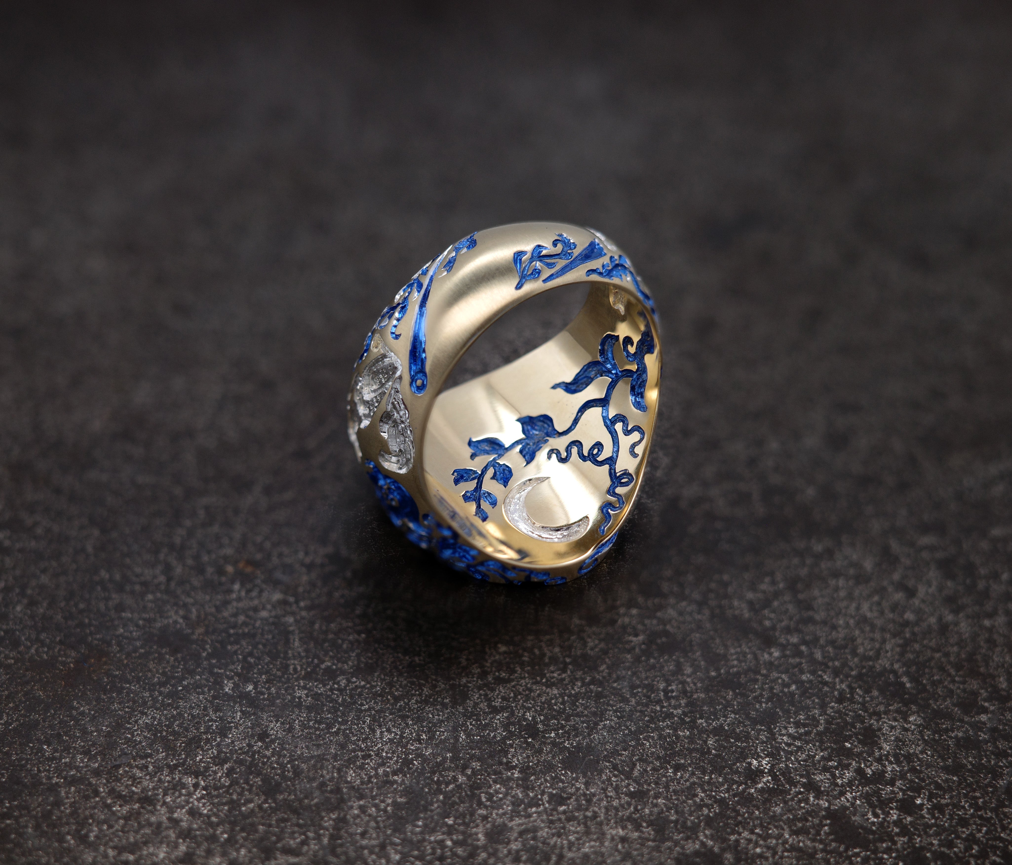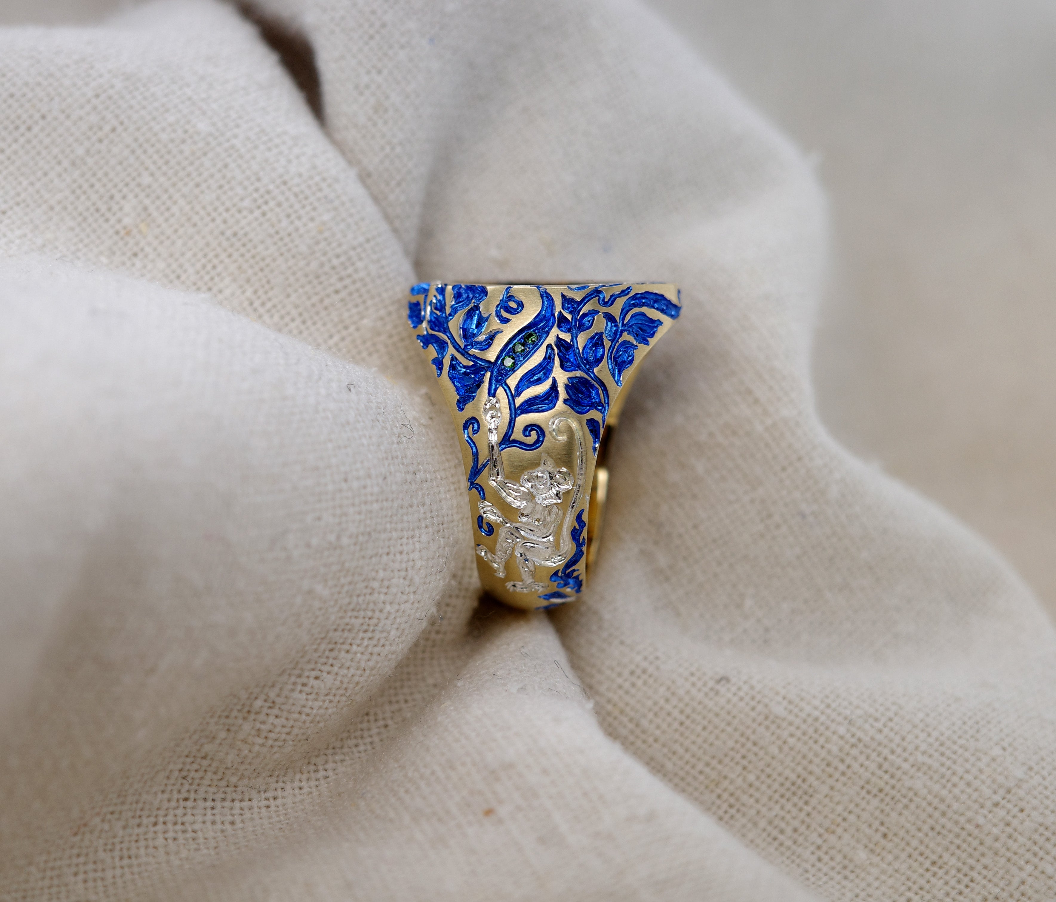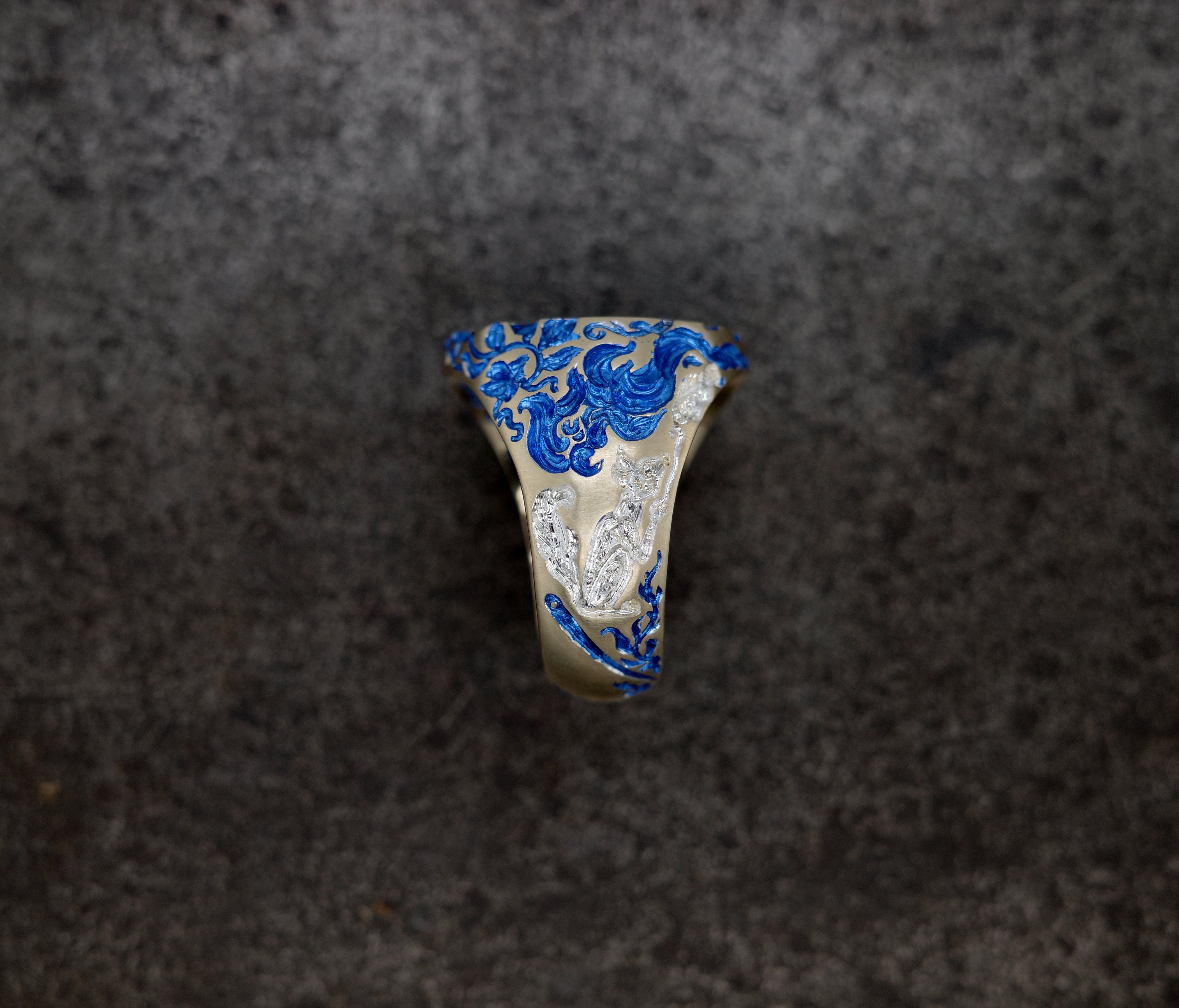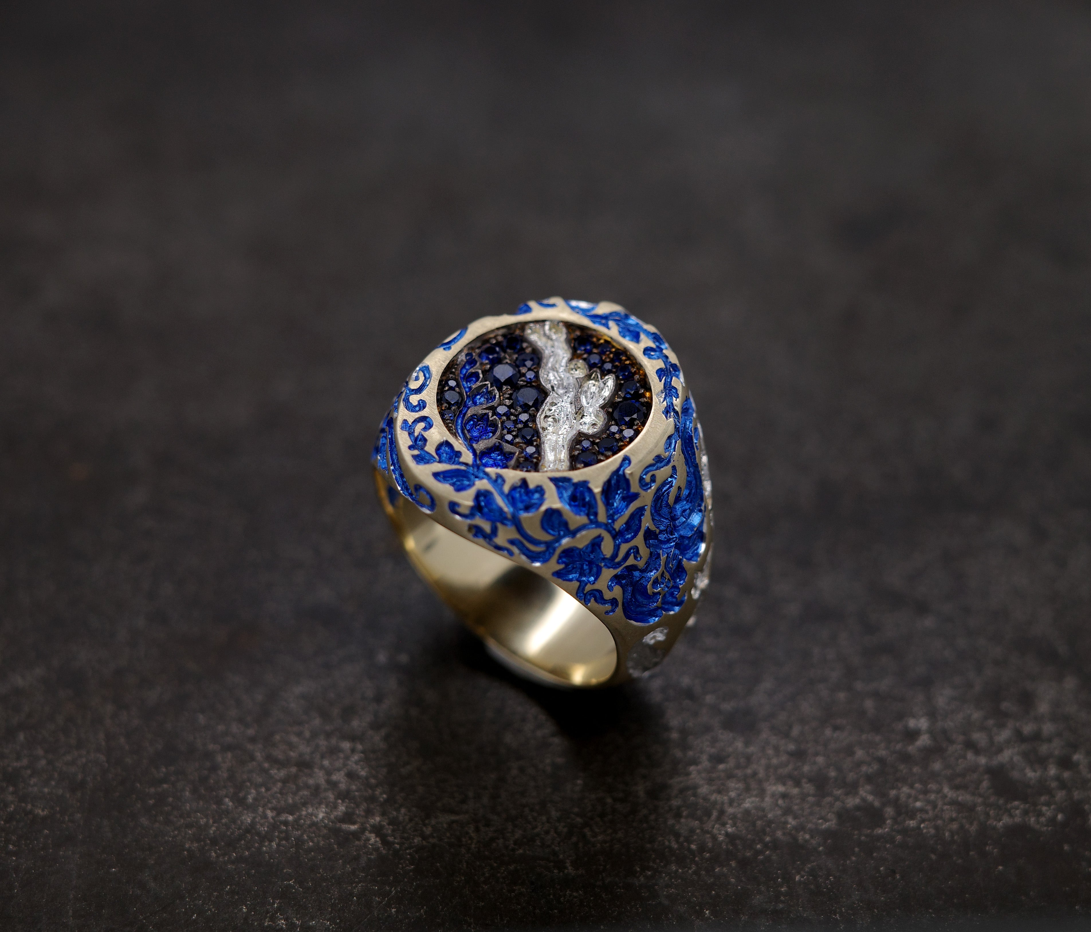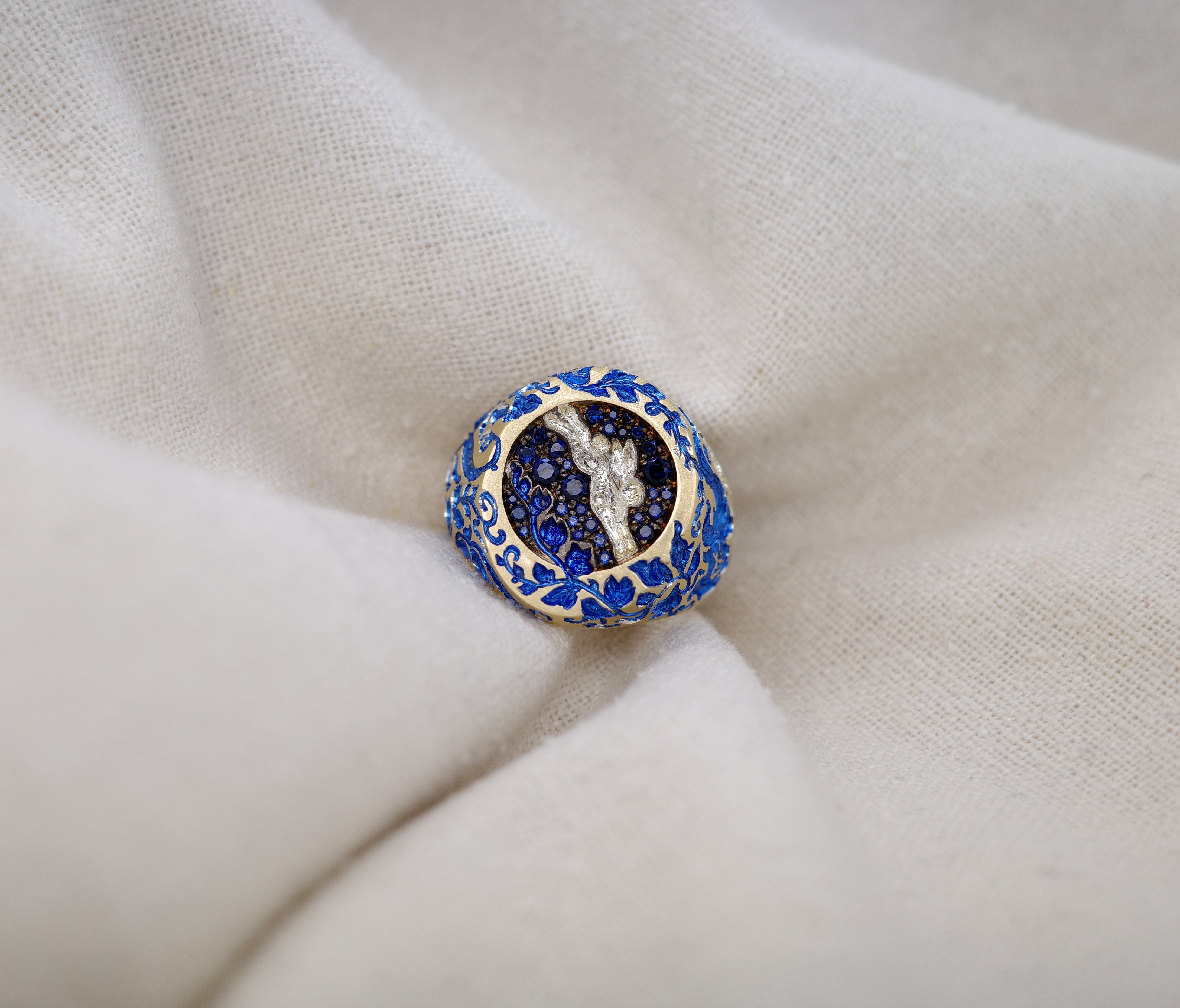 The Rabbit in the Moon Signet ring brings to life the Japanese folktale of the rabbit living on the moon. In the story, a fox, a monkey, and a rabbit encounter an old man in need of help. While all three animals gather food for him, it is the rabbit who makes the greatest sacrifice. This ring is adorned with tsavorite peas and a pavé sapphire-set full moon, symbolising the rabbit's selflessness and the enduring beauty of the tale.