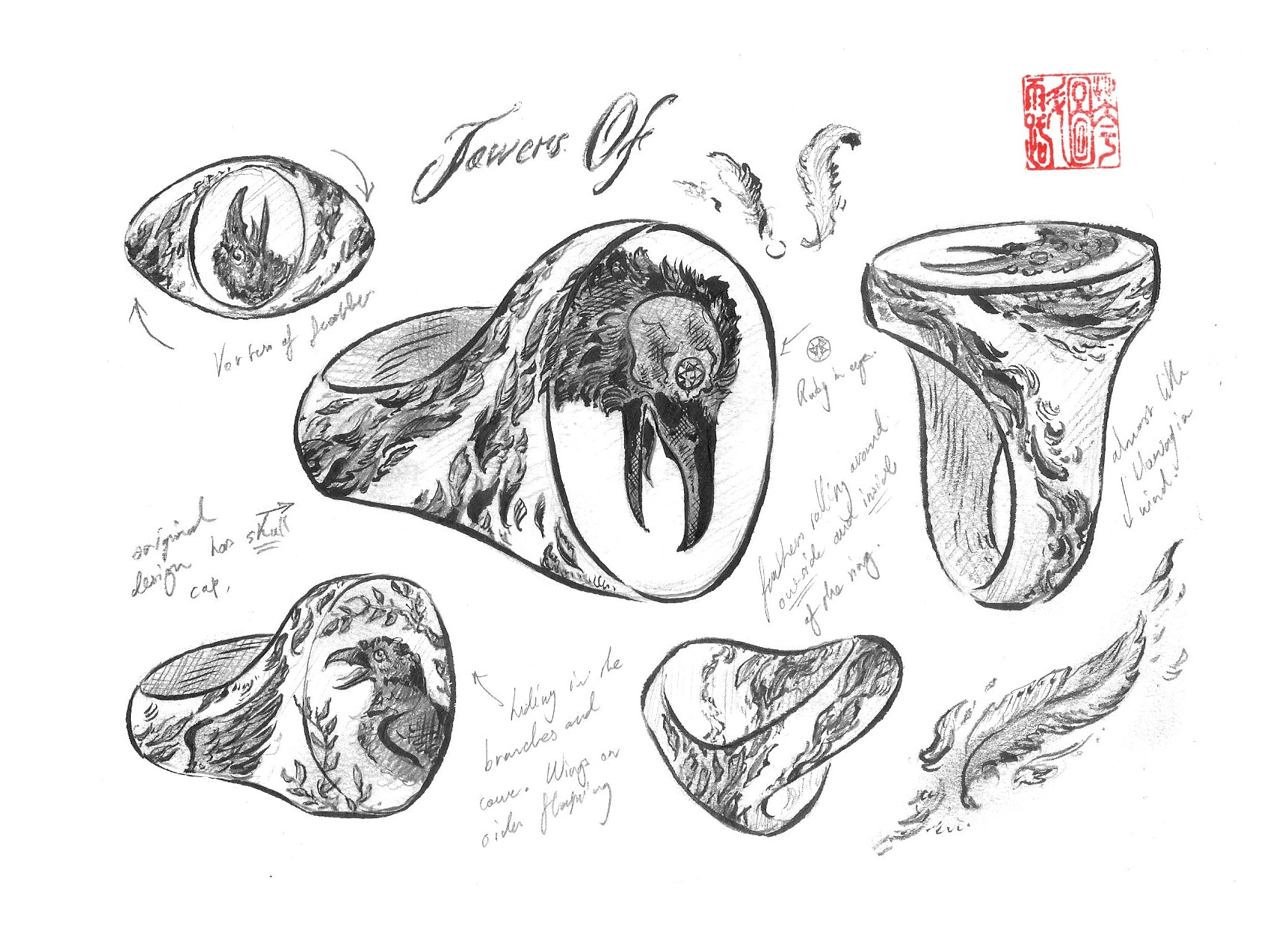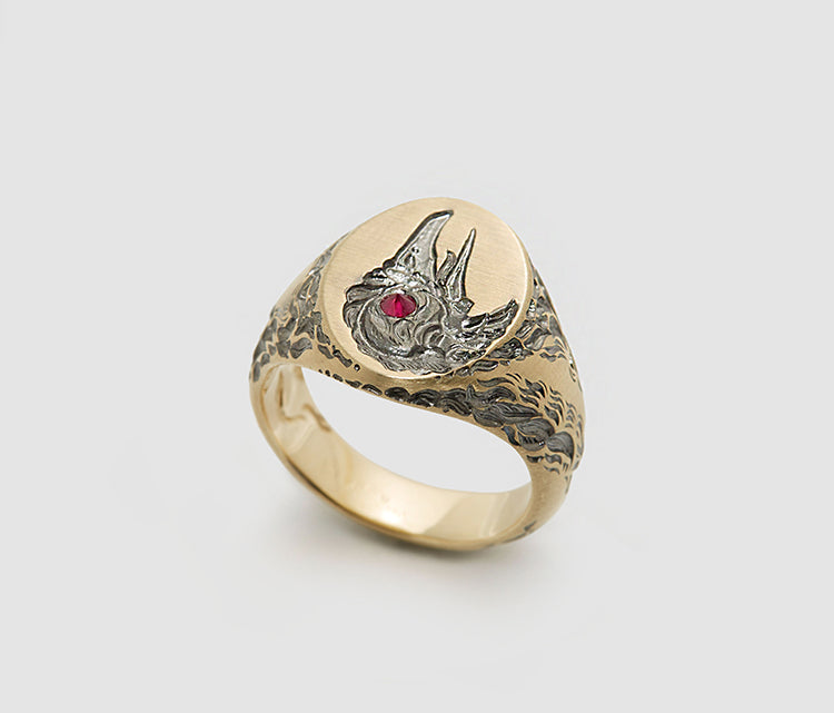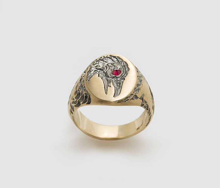 This ebony raven symbolises intellect and curiosity, offering the gift of prophetic vision that illuminates shadows and guides the exploration of inner realms. The "Tower of" Raven signet ring showcases a hand-engraved raven head, adorned with a reverse-set ruby eye and finished with black rhodium plating, capturing the mysterious essence of this enigmatic creature.